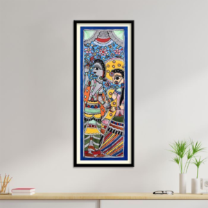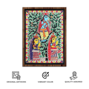 Madhubani art is famous, for its details and unique artistic methods. The borders and outlines feature lines embellished with patterns, cross-hatching, or dots. The incorporation of shapes, like circles, triangles, and squares brings about a sense of symmetry and harmony. The colors used are vibrant and flat devoid of shading resulting in captivating paintings.