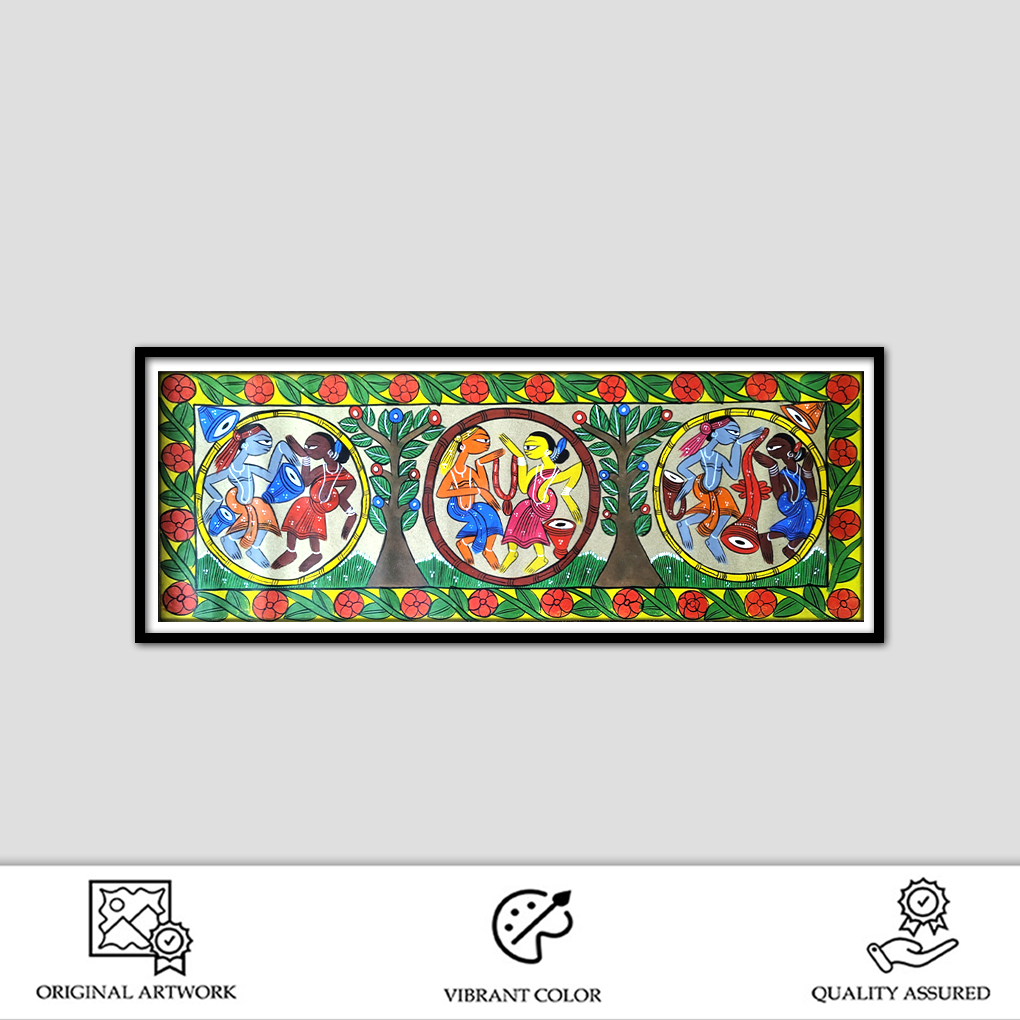 Bharni: These paintings are vibrant and lively, made with the use of bold color schemes. The depiction of Hindu gods, goddesses, and narratives from Hindu mythology and daily life are prominent in these.