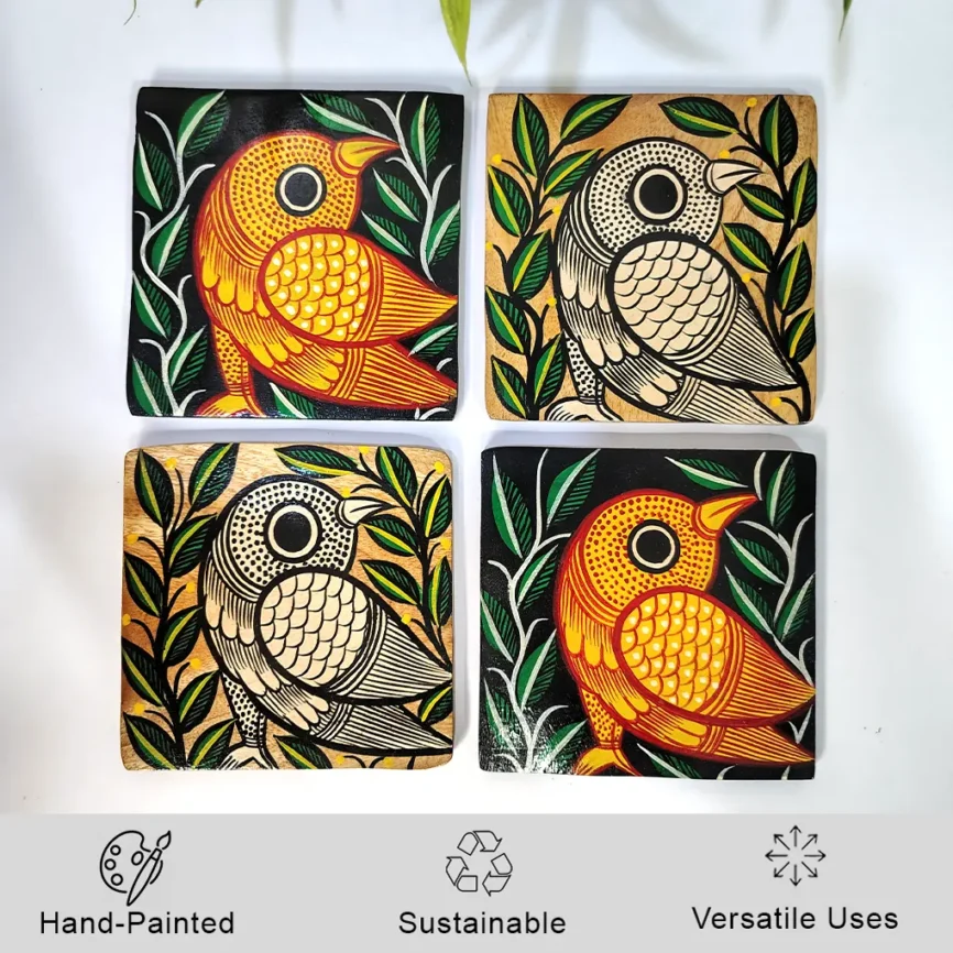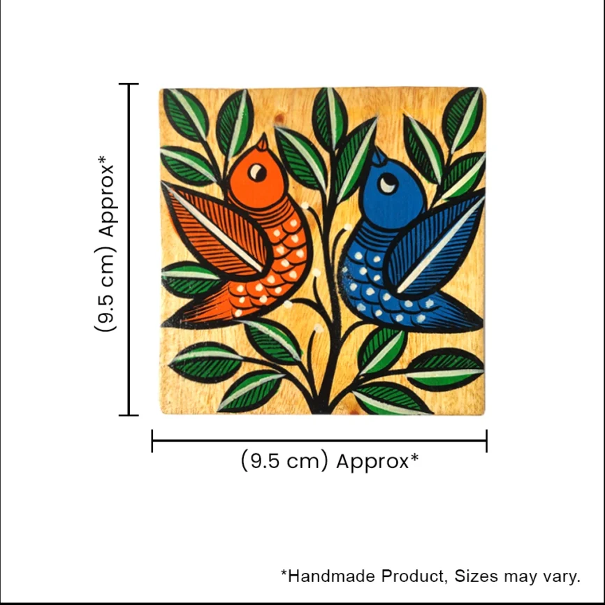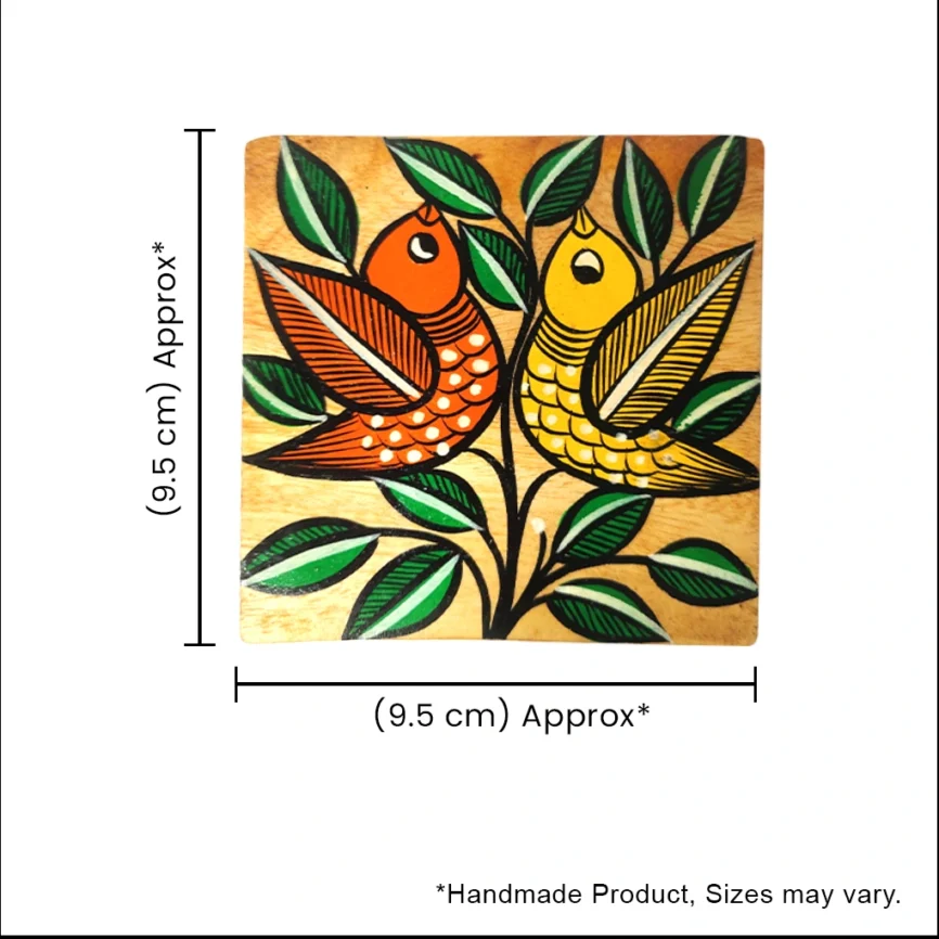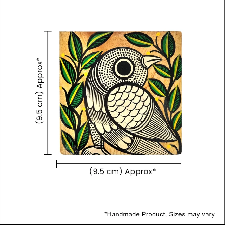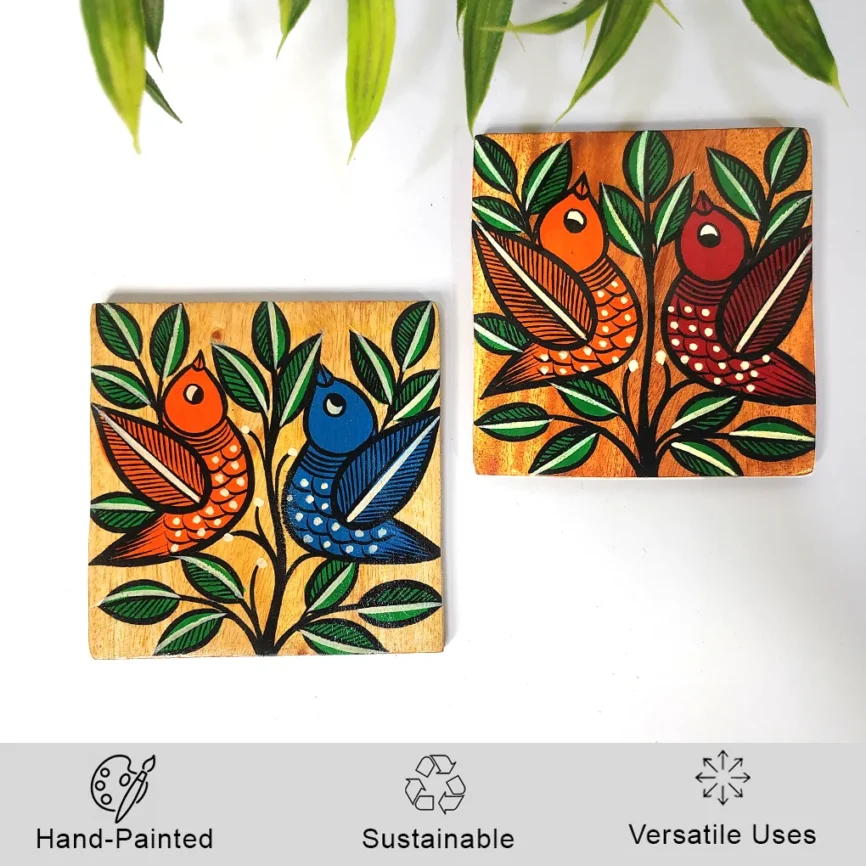Hand-Painted Square Pattachitra Bird Wooden Coaster Set (2 Eco-Friendly Tea Coasters)