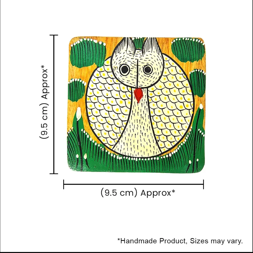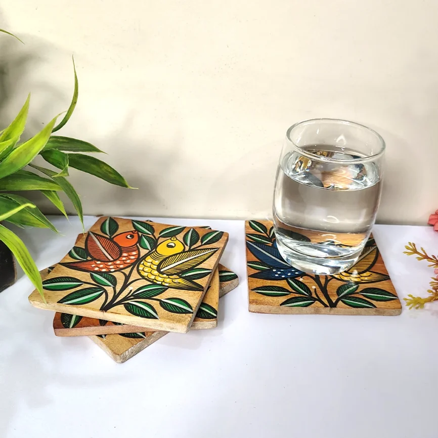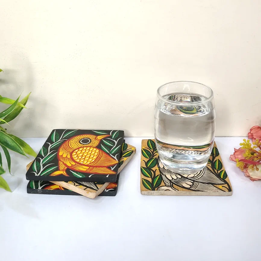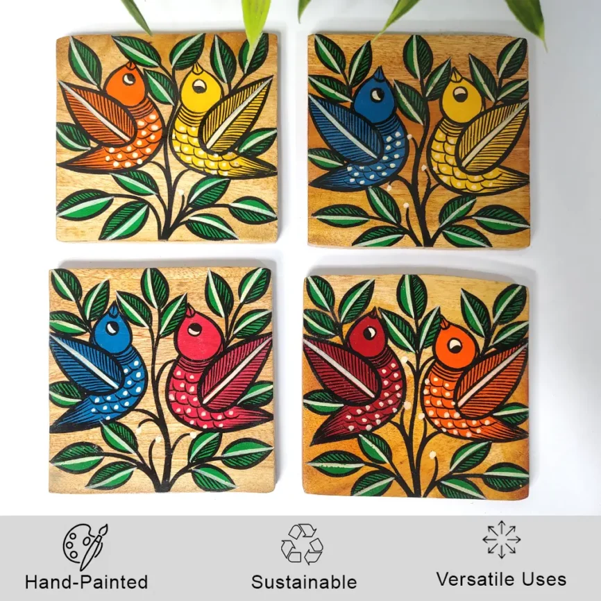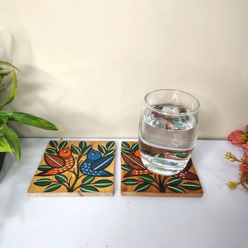 Hand-Painted Square Pattachitra Bird Wooden Coaster Set (2 Eco-Friendly Tea Coasters)