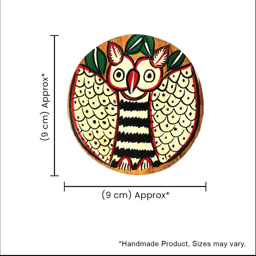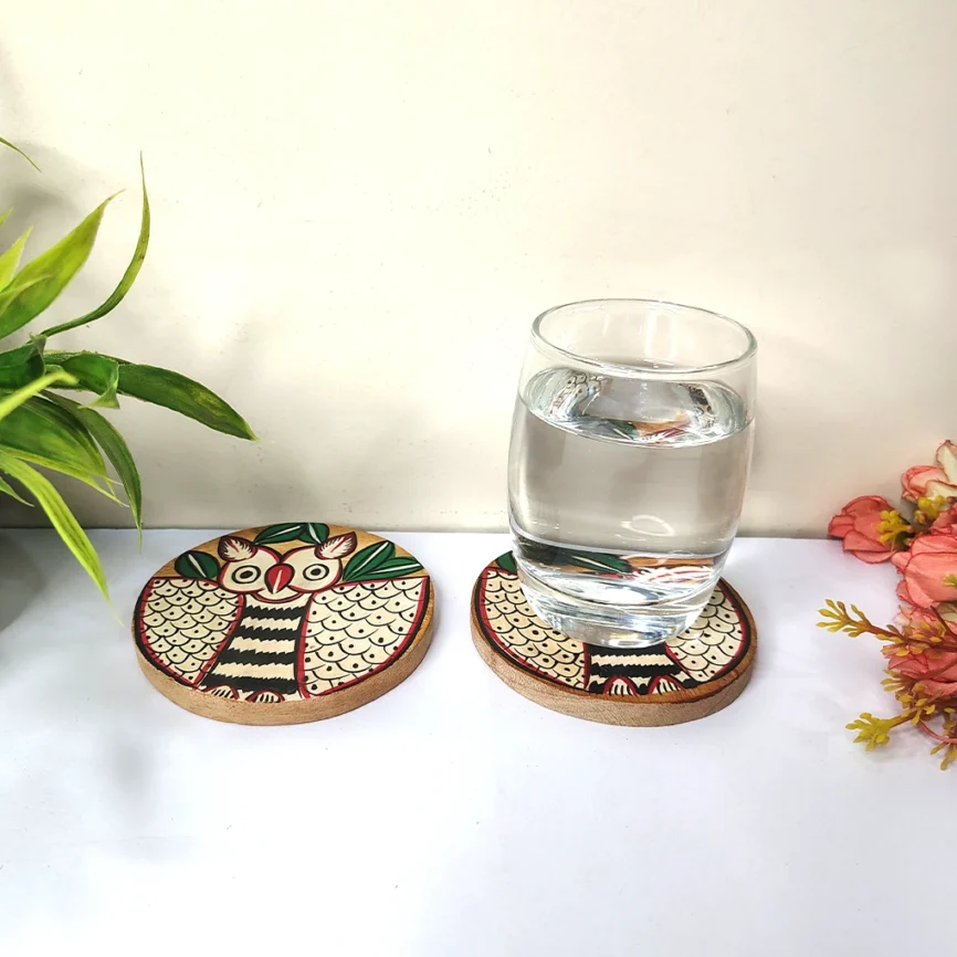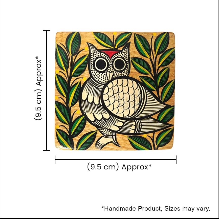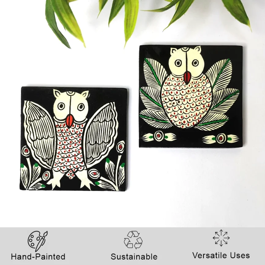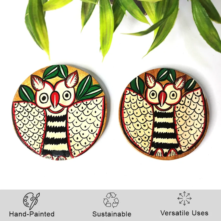 Hand-Painted Pattachitra Owl Wooden Coaster Set (2 Eco-Friendly Tea Coasters)