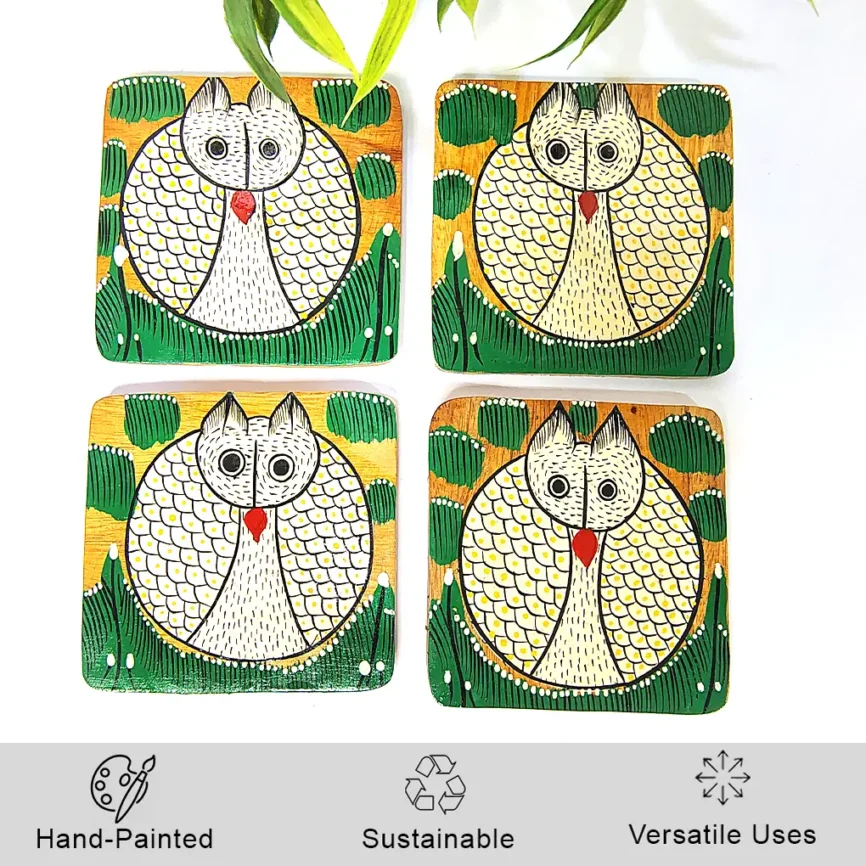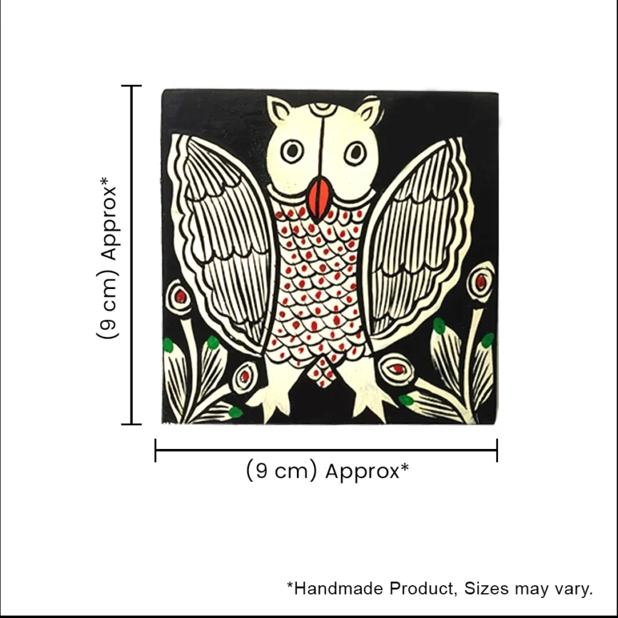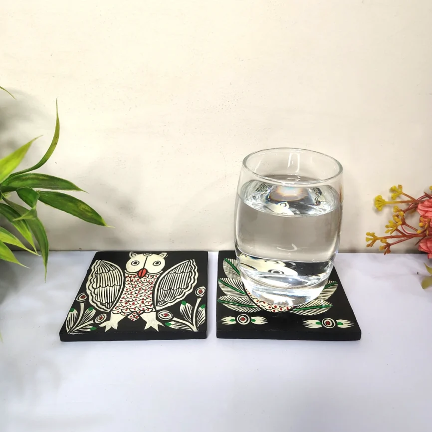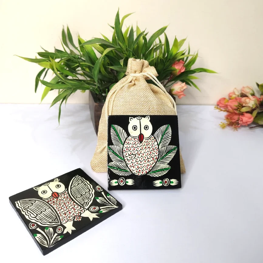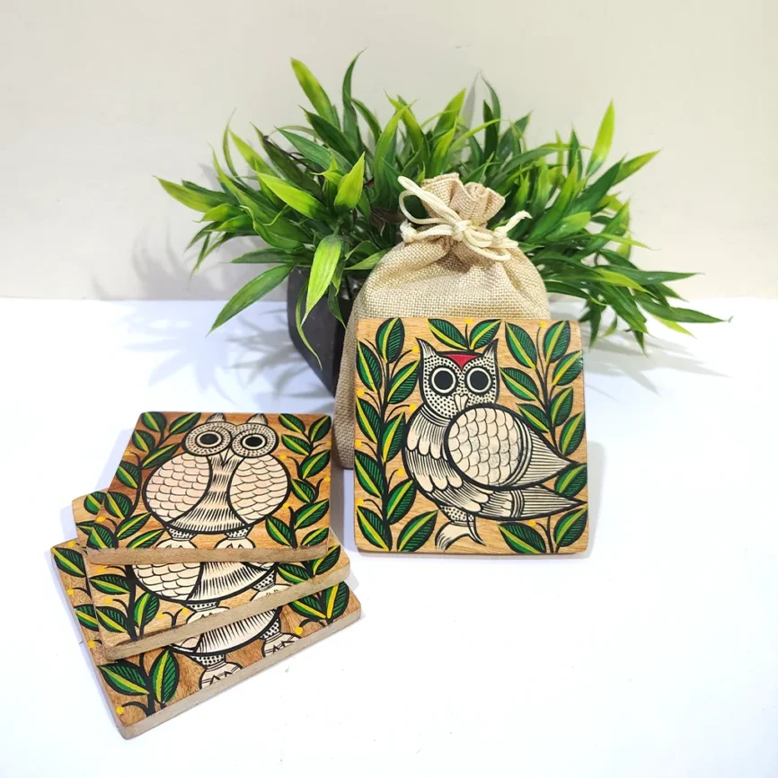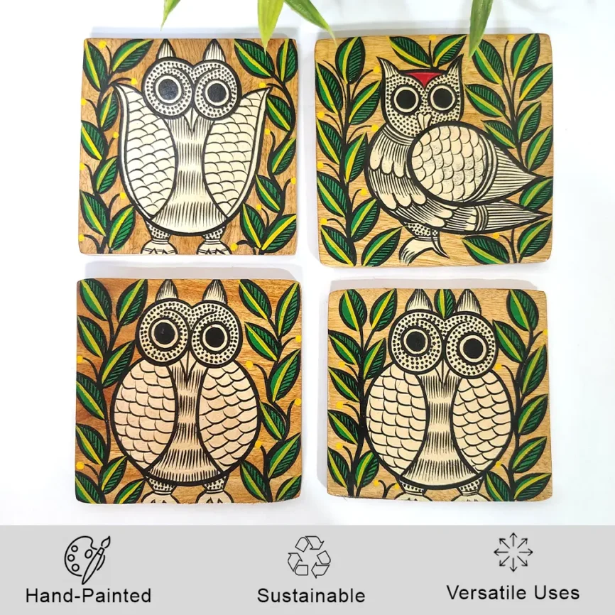 Hand-Painted Pattachitra Owl Wooden Coaster Set (2 Eco-Friendly Tea Coasters)
