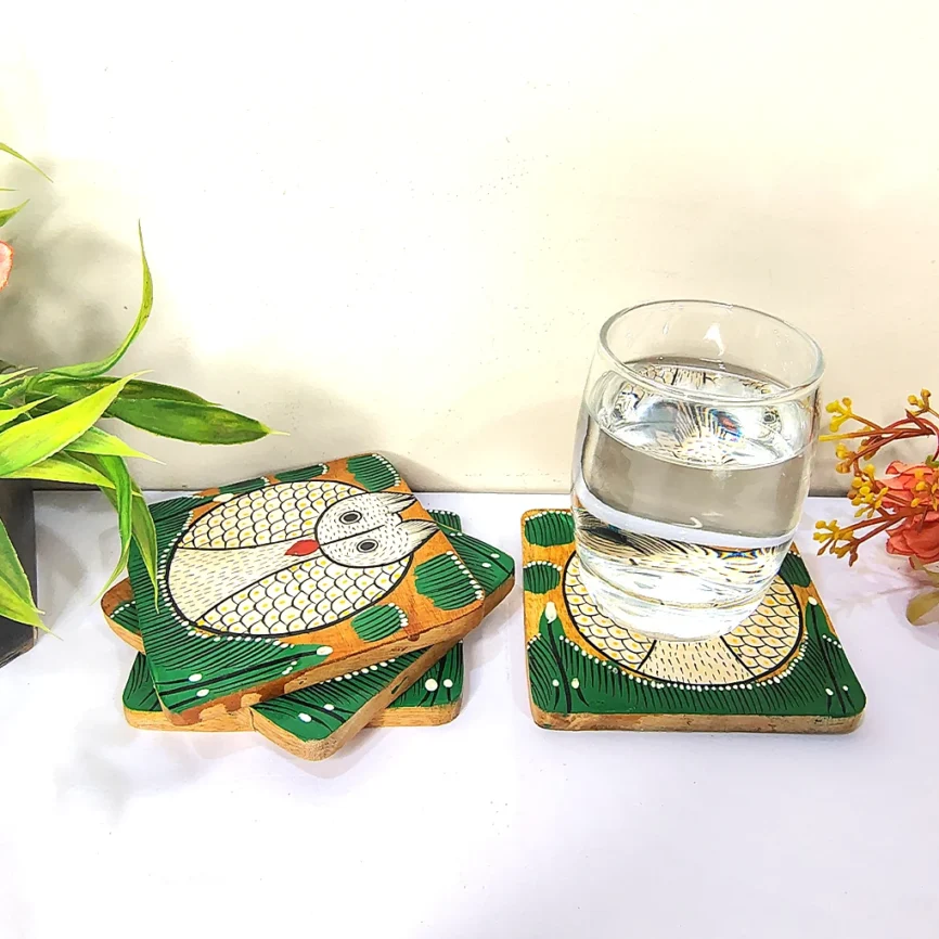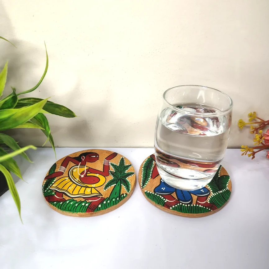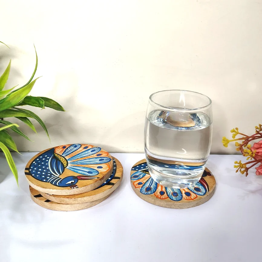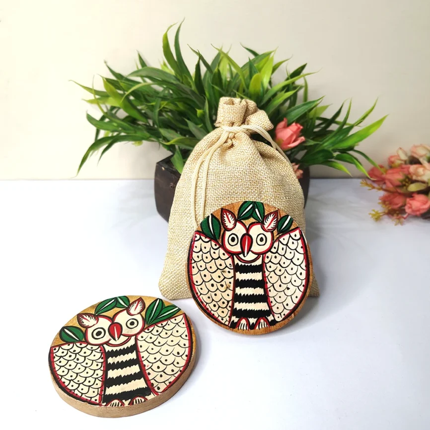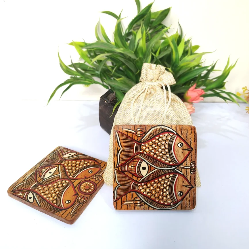 Add charm and functionality to your home with our handcrafted wooden coasters. Each wooden coaster set is beautifully designed with intricate Pattachitra artwork, blending traditional craftsmanship with modern style. Made from premium-quality wood, our round wooden coasters and wooden tea coasters protect your tables from moisture, heat, and spills while adding a refined touch to your décor. Whether you’re looking to buy wooden coasters for everyday use or as a thoughtful gift, explore our exclusive range of handcrafted wooden coaster sets that perfectly complement any table setting.
