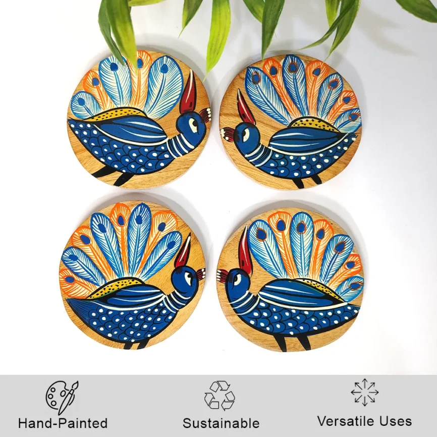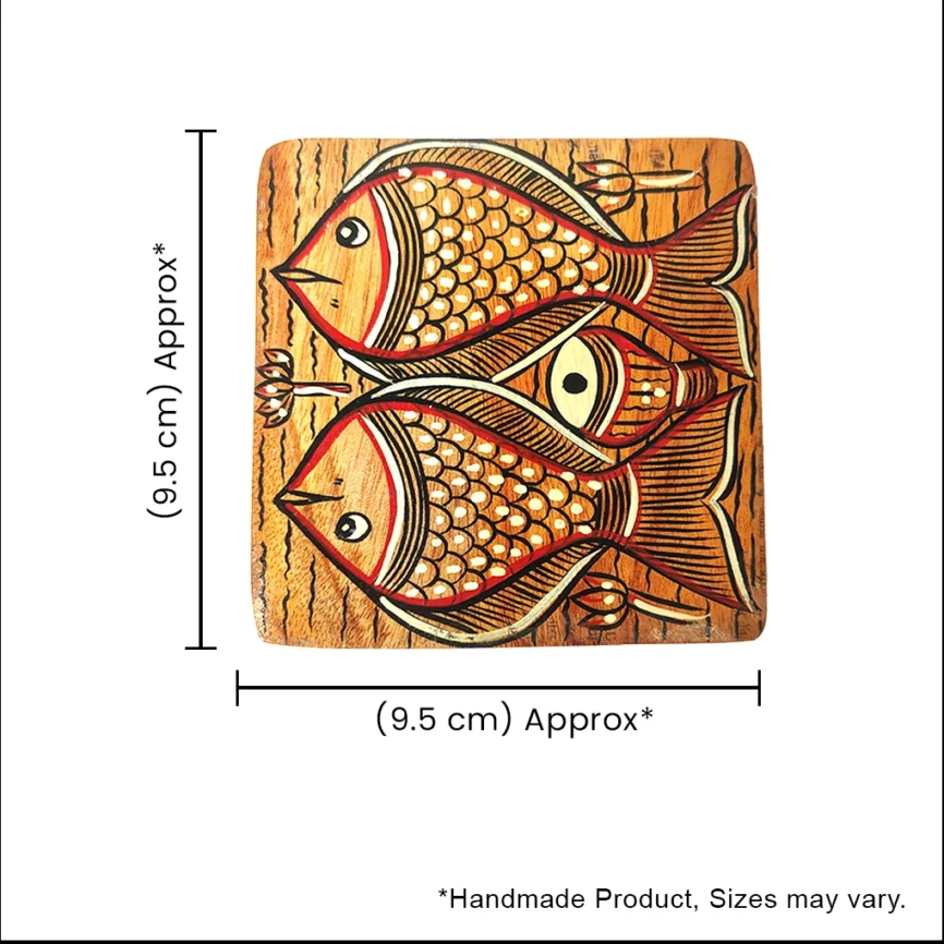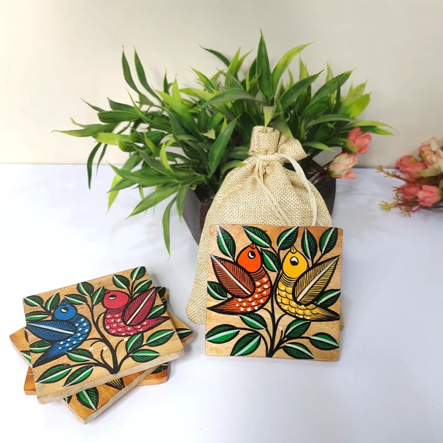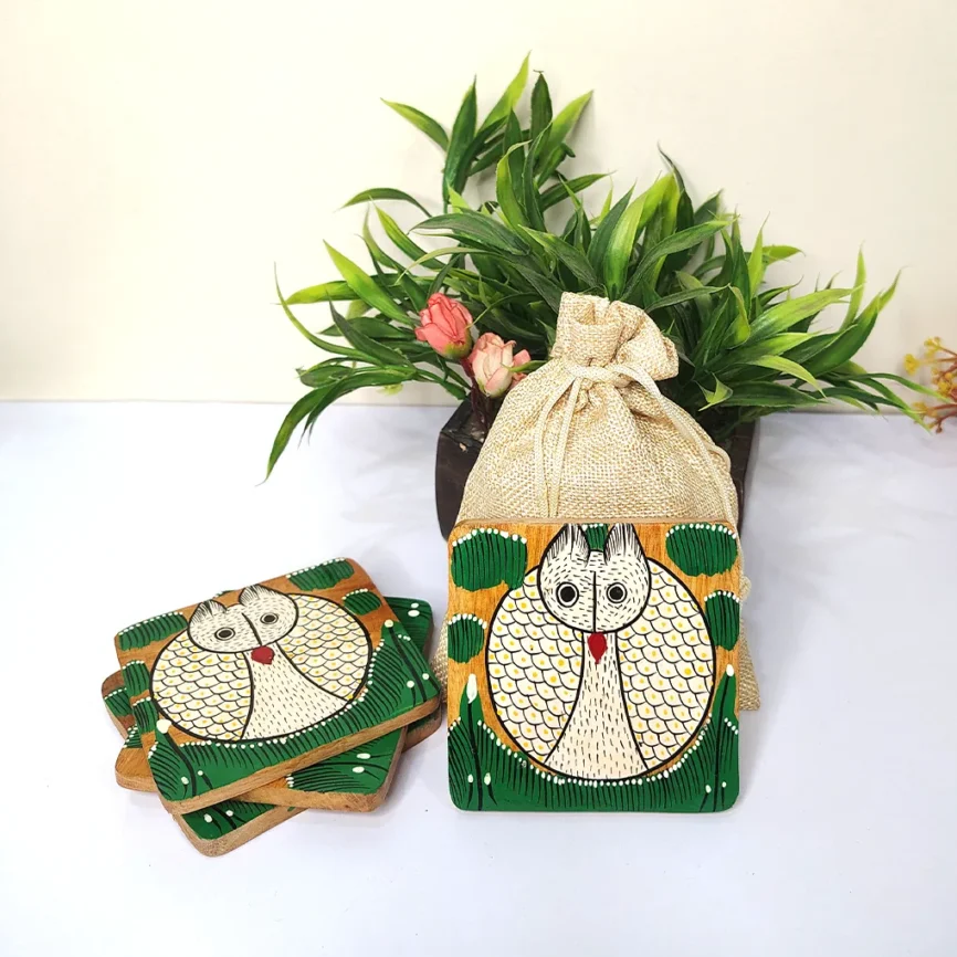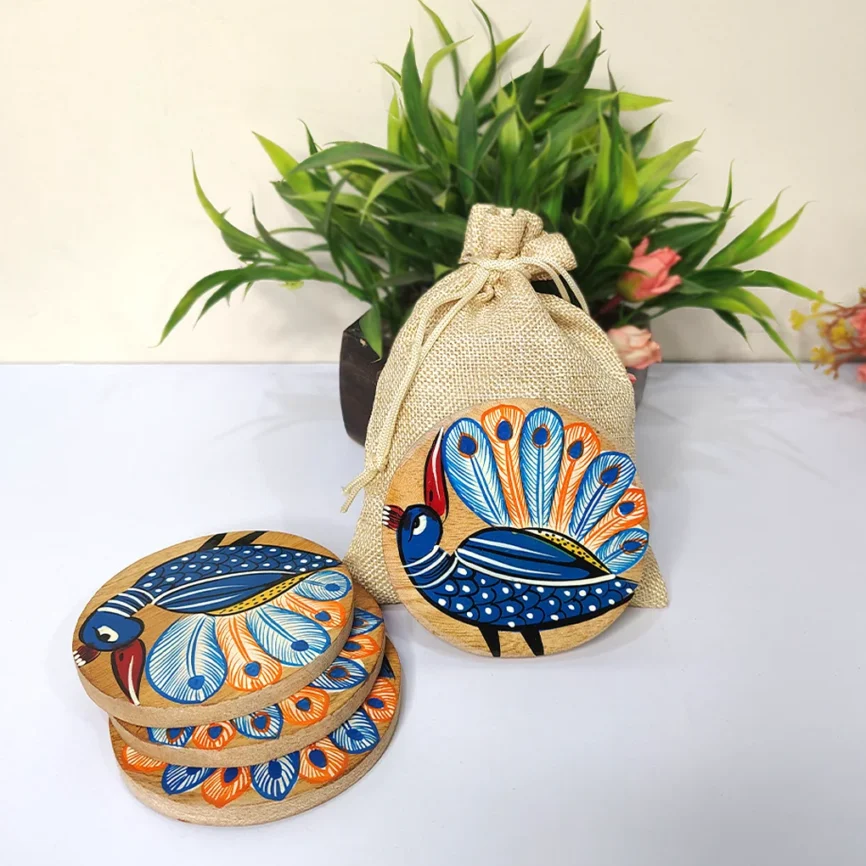 Add charm and functionality to your home with our handcrafted wooden coasters. Each wooden coaster set is beautifully designed with intricate Pattachitra artwork, blending traditional craftsmanship with modern style. Made from premium-quality wood, our round wooden coasters and wooden tea coasters protect your tables from moisture, heat, and spills while adding a refined touch to your décor. Whether you’re looking to buy wooden coasters for everyday use or as a thoughtful gift, explore our exclusive range of handcrafted wooden coaster sets that perfectly complement any table setting.