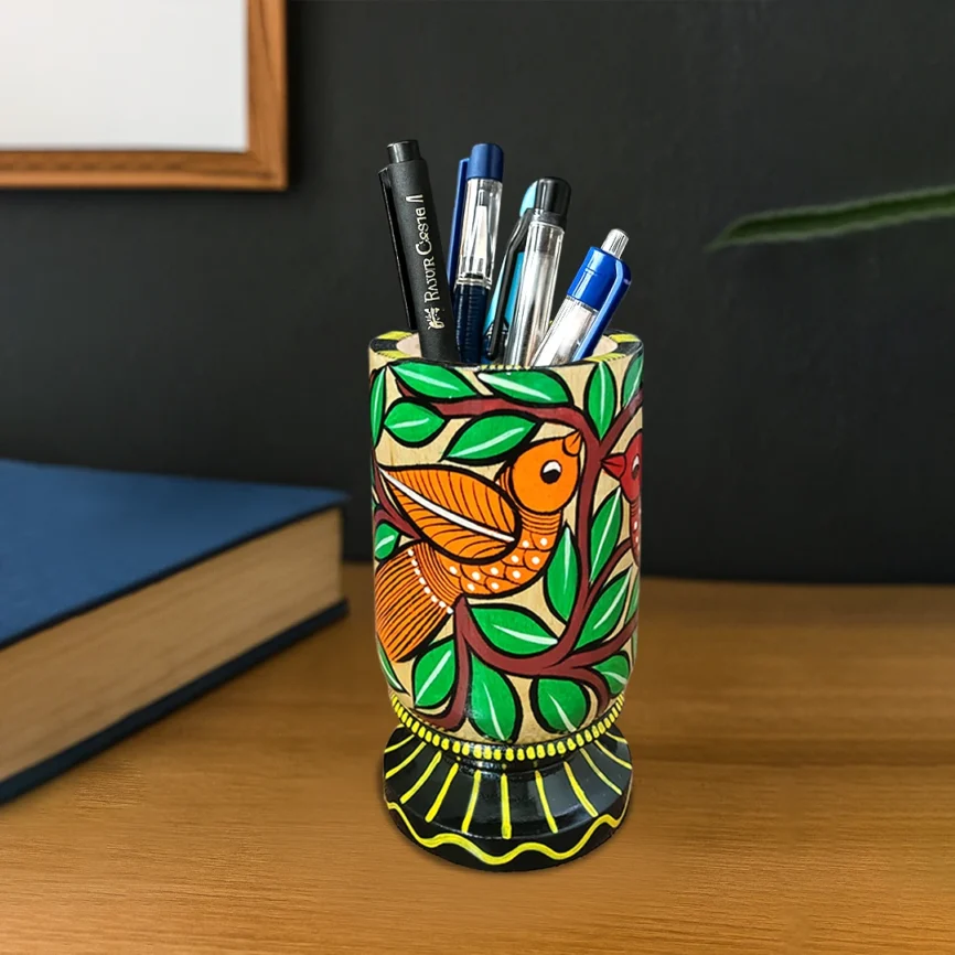 Hand-Painted Pattachitra Wooden Pen Stand Bird Design/Cutlery Holder