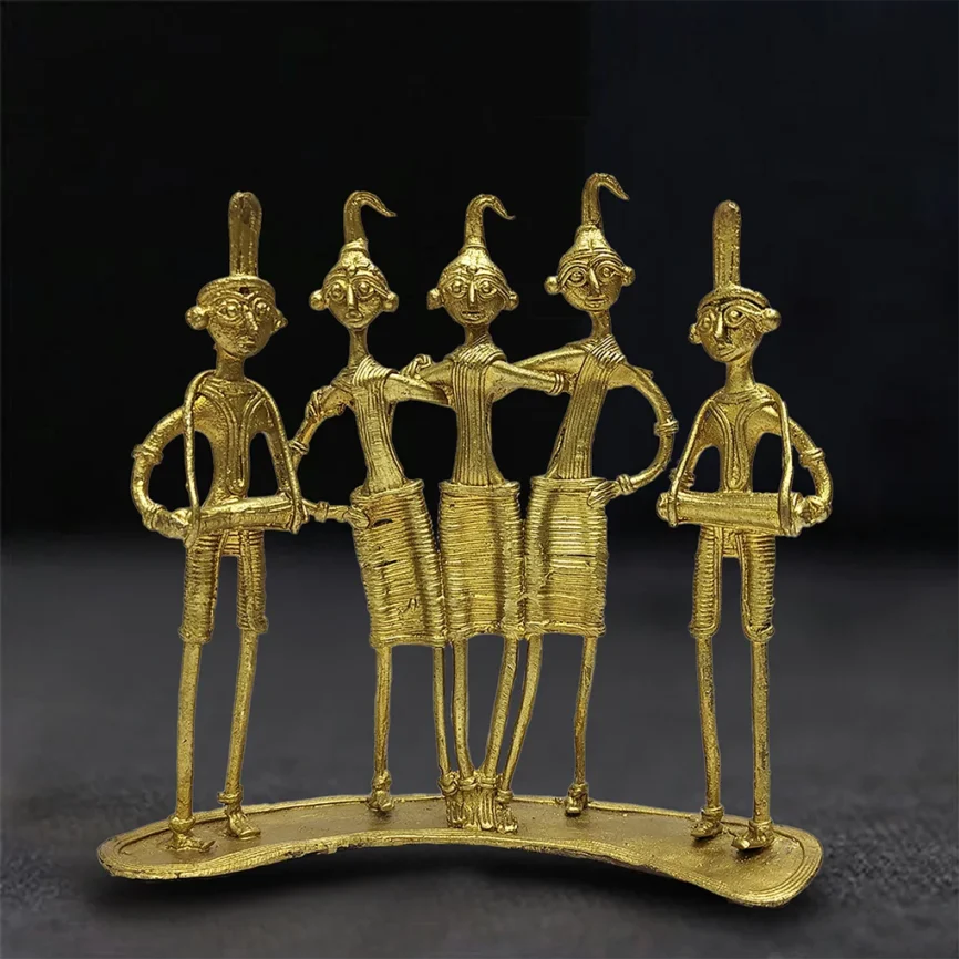 Ans: You can explore figurines, animal motifs, tribal musicians, ritual objects, lamps, and Dhokra Art wall hanging designs—each piece symbolizing tribal life and spirituality.
