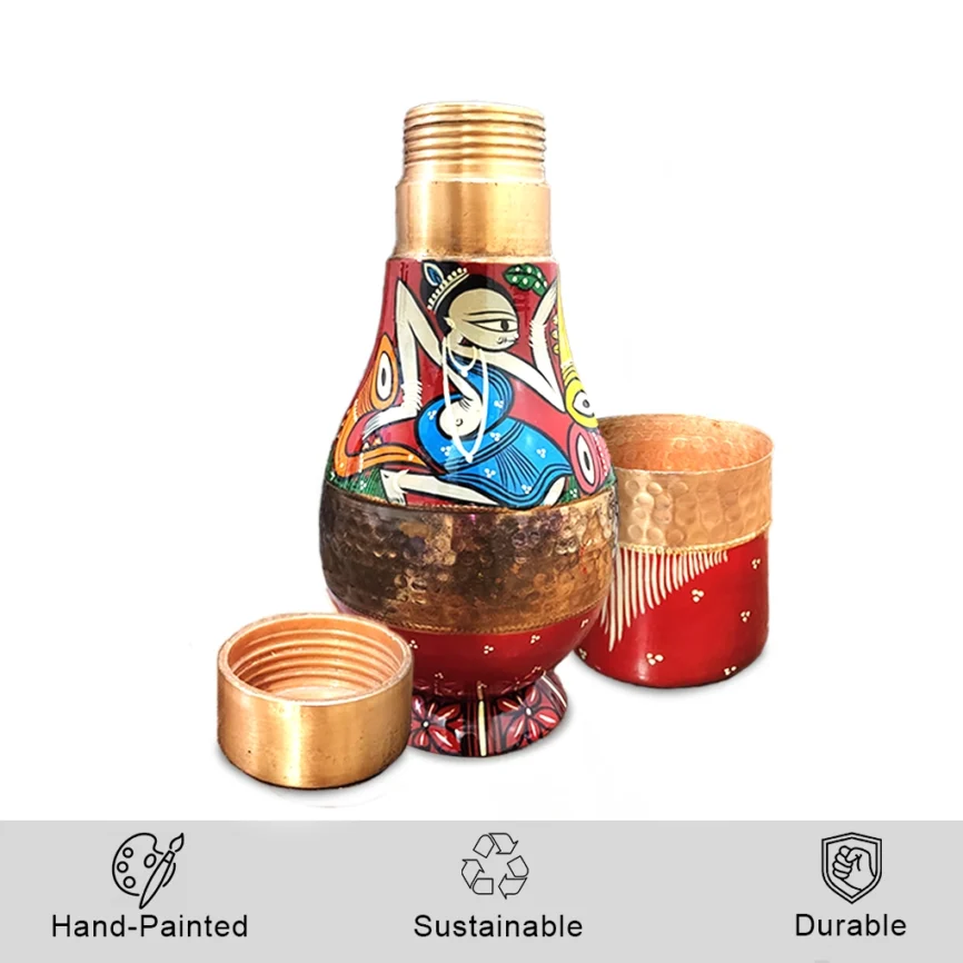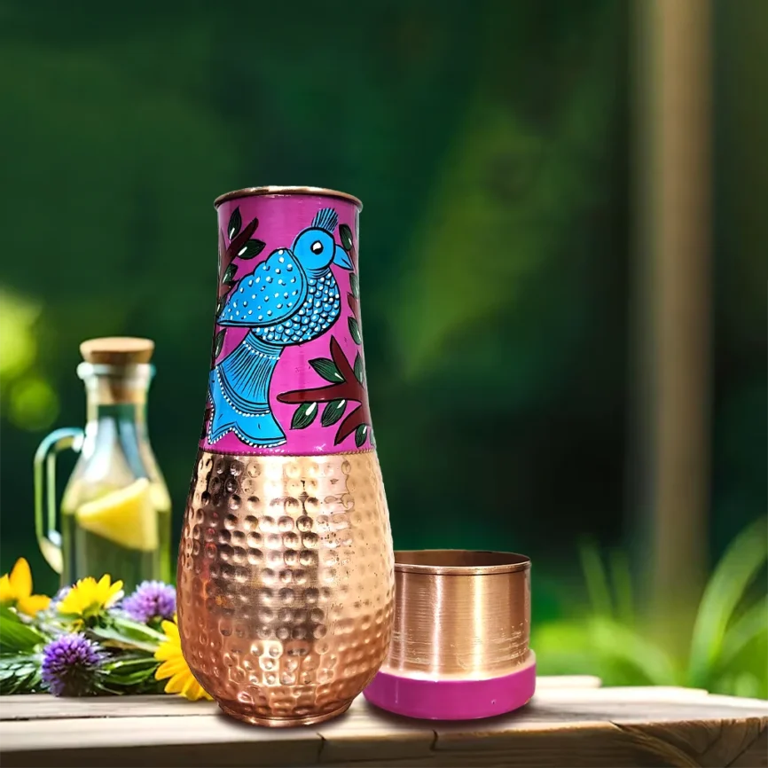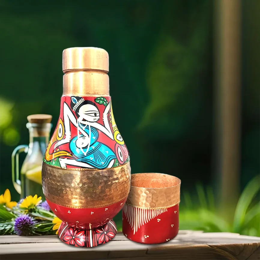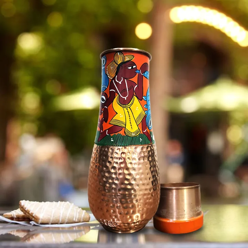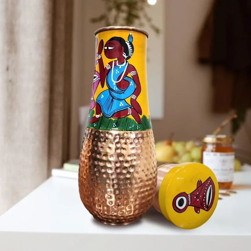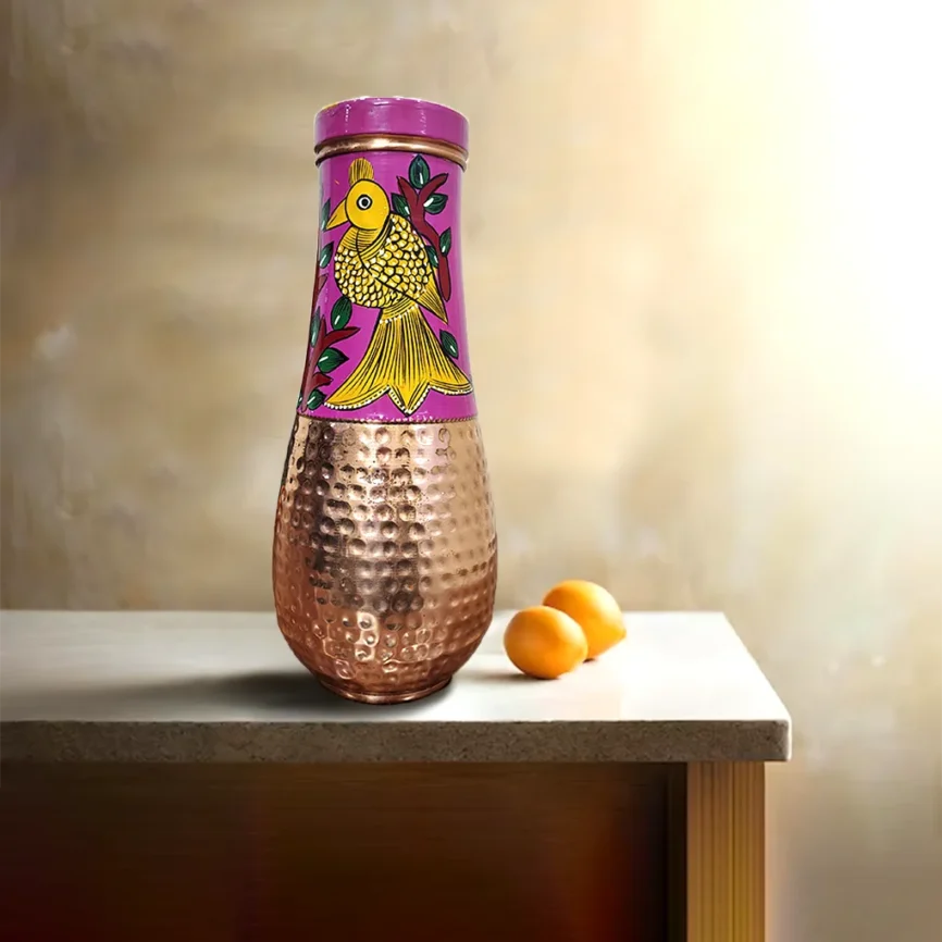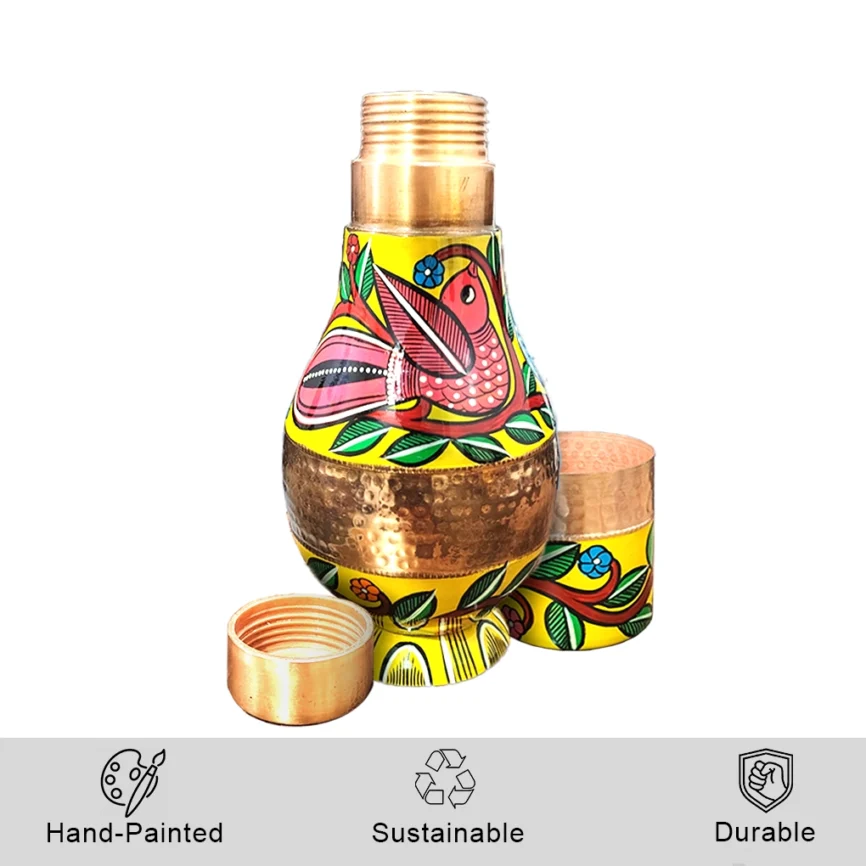 Bring a blend of tradition, wellness, and elegance into your everyday hydration with this beautifully crafted and painted Copper Bottle. Designed with a timeless hammered texture, it not only adds a touch of sophistication but also reflects the rich heritage of Indian craftsmanship. Handmade from pure copper, this bottle is known for its natural health benefits. Storing water in copper vessels has been an age-old practice in Ayurveda, believed to purify water, balance the three doshas (Vata, Pitta, Kapha), and boost immunity. Its sturdy build makes it ideal for daily use at home, office, yoga sessions, or even as a thoughtful eco-friendly gift.