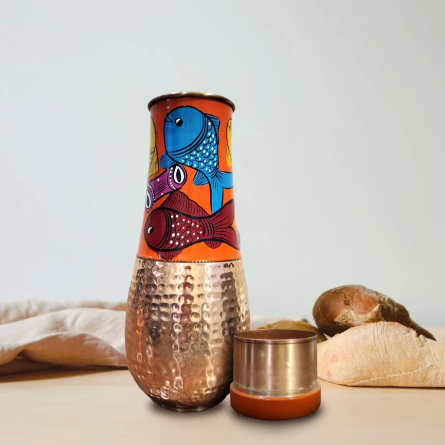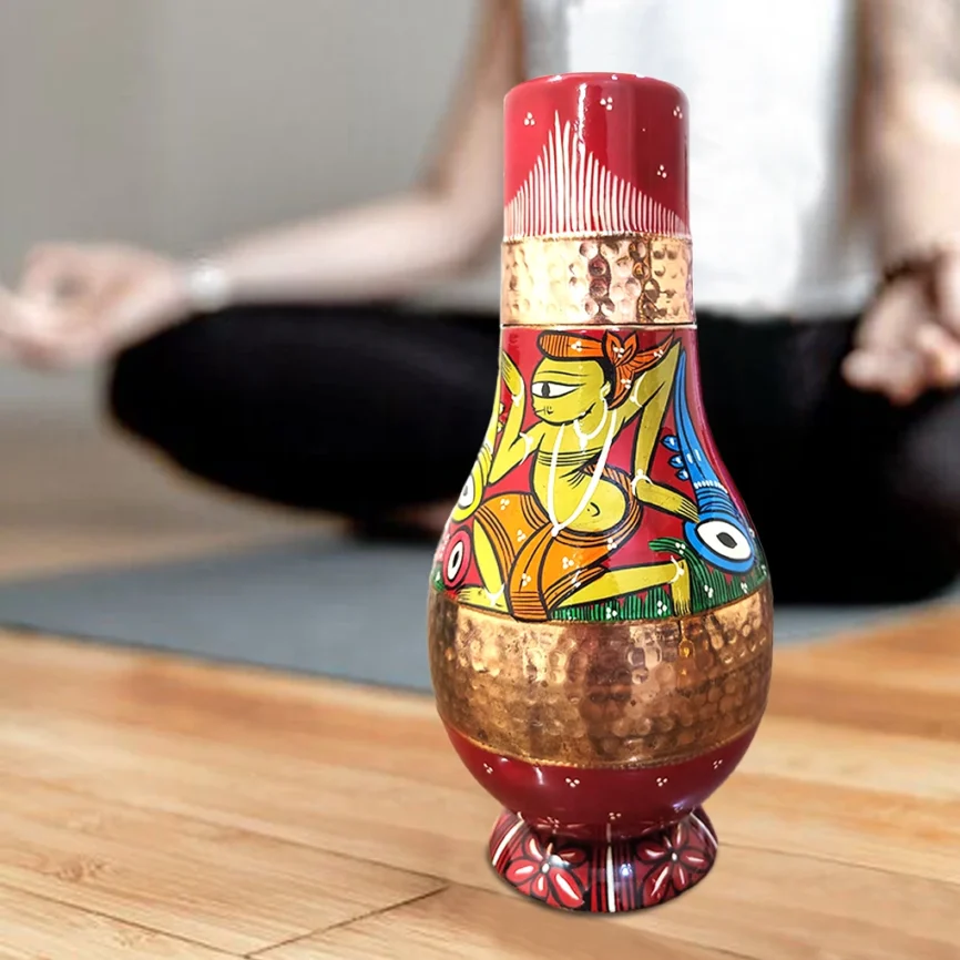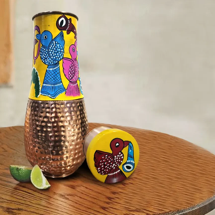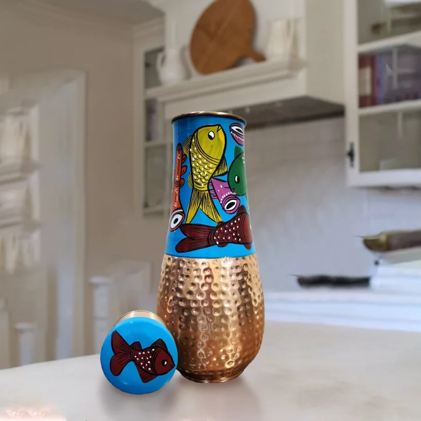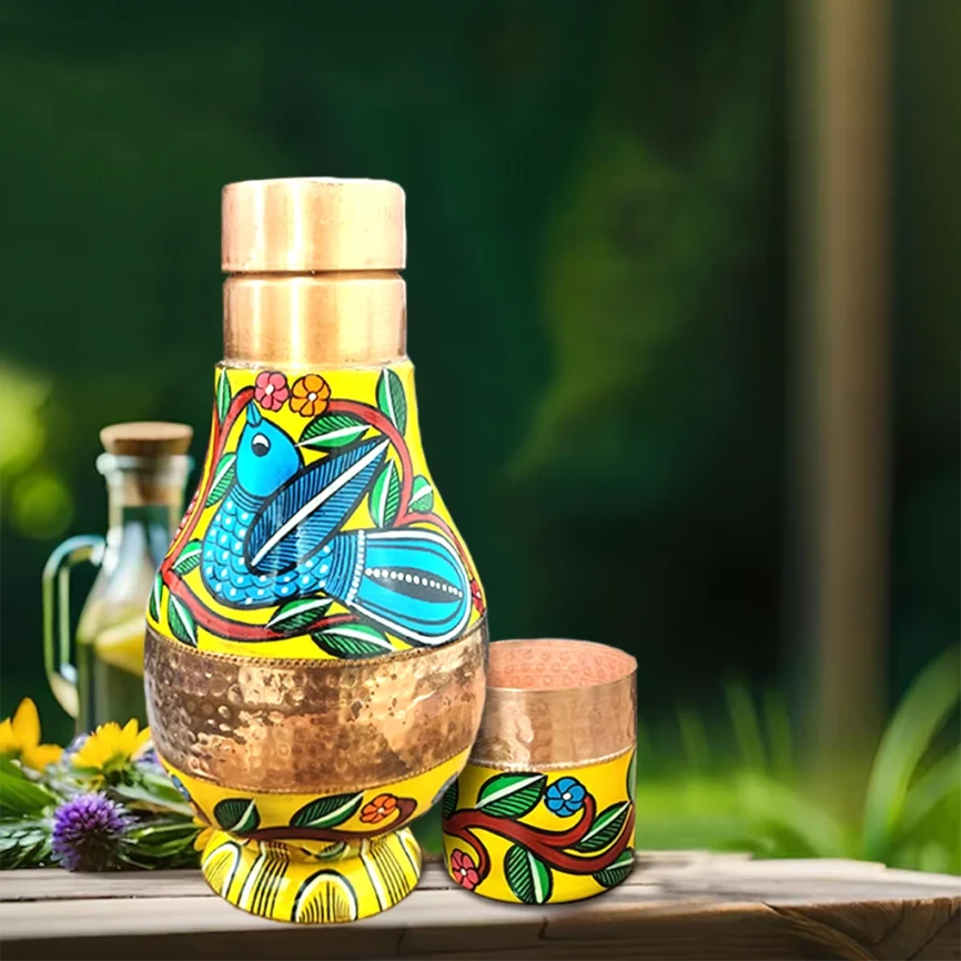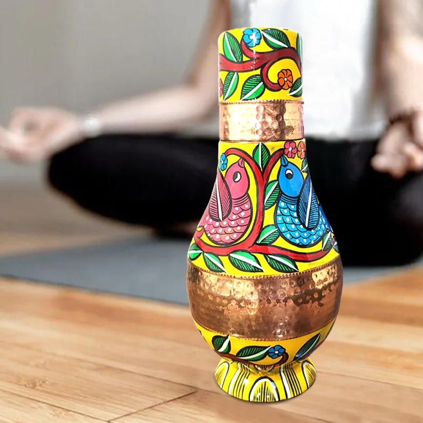 Bring a blend of tradition, wellness, and elegance into your everyday hydration with this beautifully crafted and painted Copper Bottle. Designed with a timeless hammered texture, it not only adds a touch of sophistication but also reflects the rich heritage of Indian craftsmanship. Handmade from pure copper, this bottle is known for its natural health benefits. Storing water in copper vessels has been an age-old practice in Ayurveda, believed to purify water, balance the three doshas (Vata, Pitta, Kapha), and boost immunity. Its sturdy build makes it ideal for daily use at home, office, yoga sessions, or even as a thoughtful eco-friendly gift.