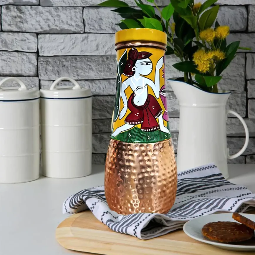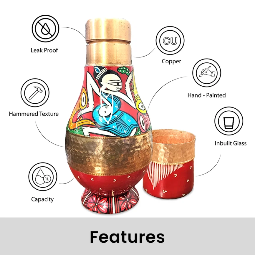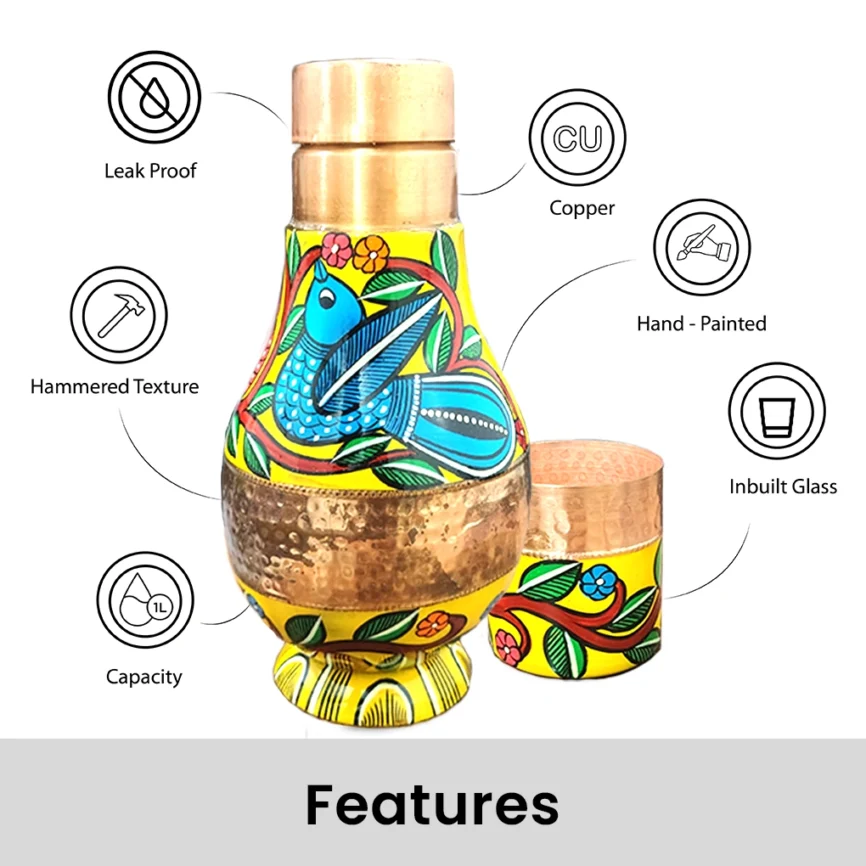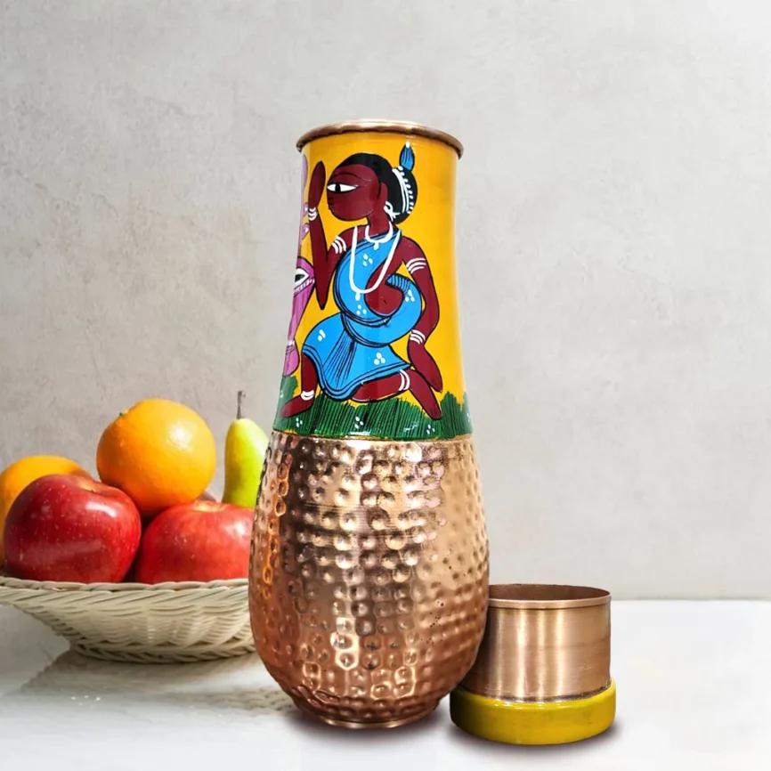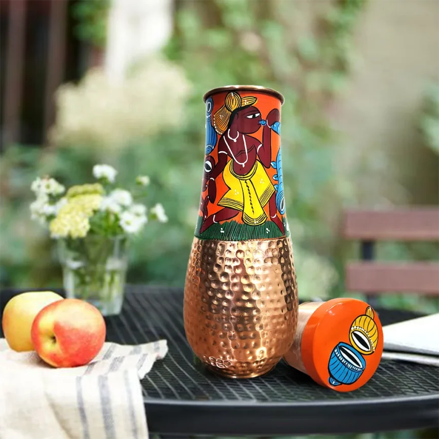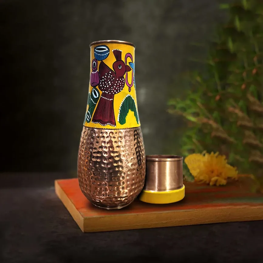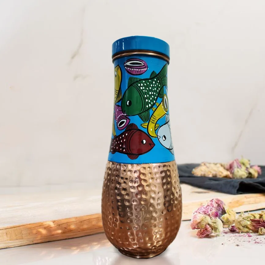 Bring a blend of tradition, wellness, and elegance into your everyday hydration with this beautifully crafted and painted Copper Bottle. Designed with a timeless hammered texture, it not only adds a touch of sophistication but also reflects the rich heritage of Indian craftsmanship. Handmade from pure copper, this bottle is known for its natural health benefits. Storing water in copper vessels has been an age-old practice in Ayurveda, believed to purify water, balance the three doshas (Vata, Pitta, Kapha), and boost immunity. Its sturdy build makes it ideal for daily use at home, office, yoga sessions, or even as a thoughtful eco-friendly gift.