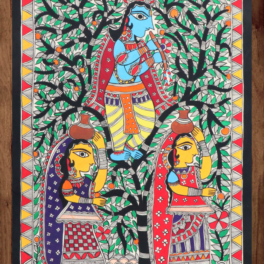 krishna with two gopis mithila art madhubani painting