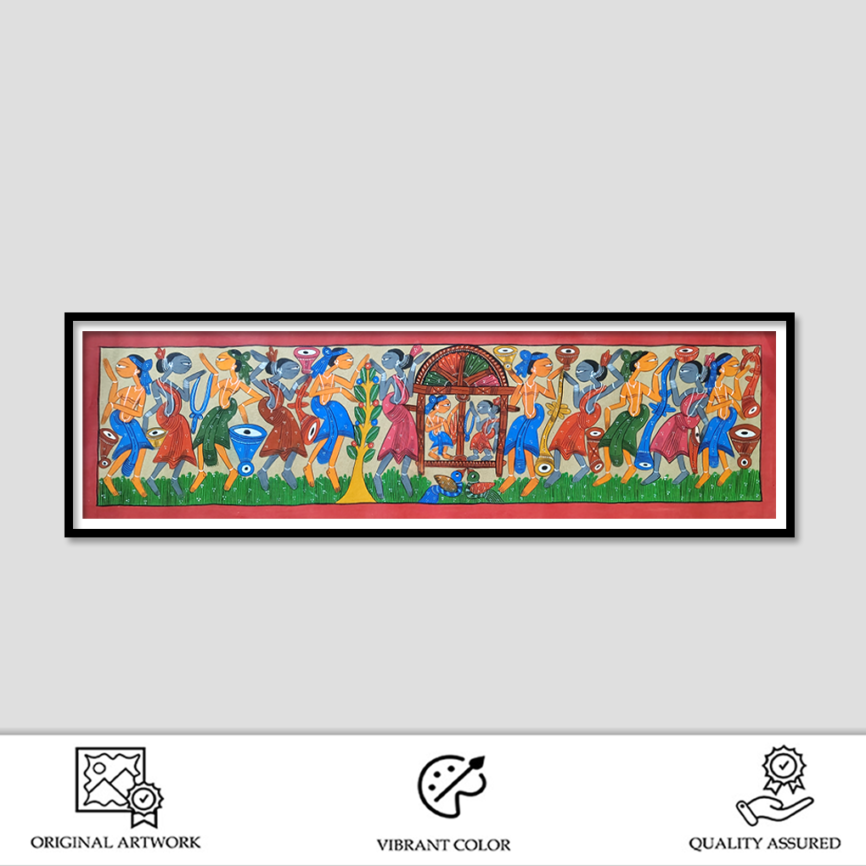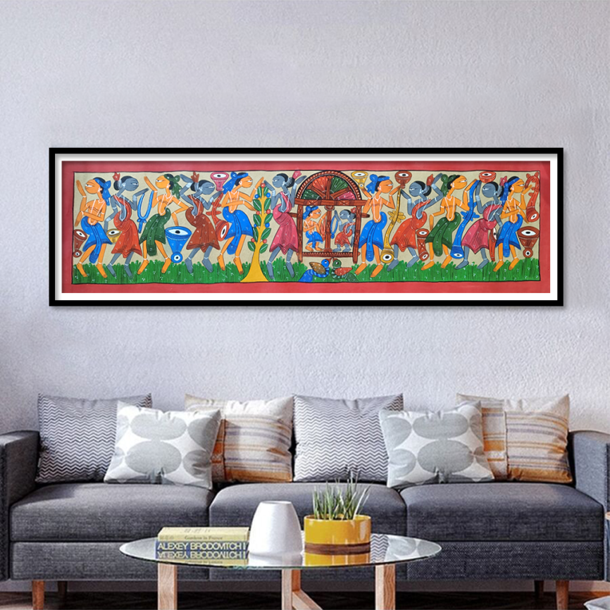 Large Pattachitra Tribal Celebration Painting – 48 x 14.5 Inches | Handcrafted Traditional Artwork