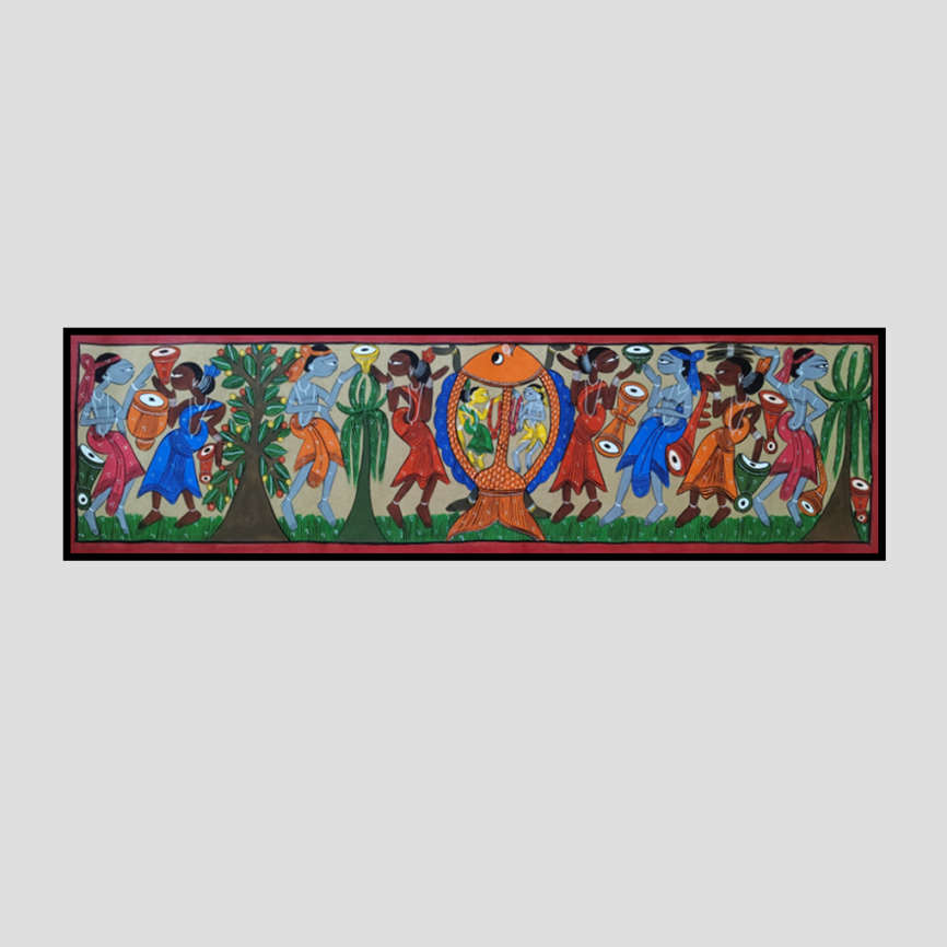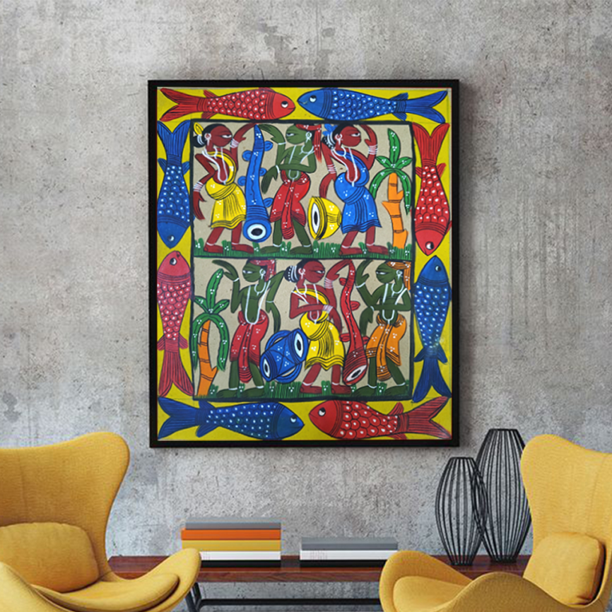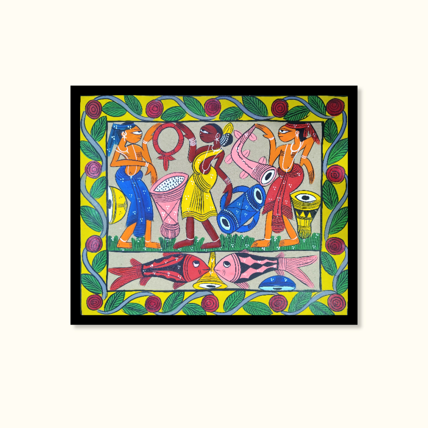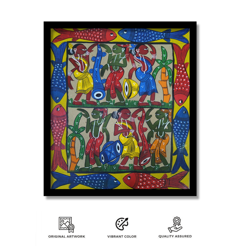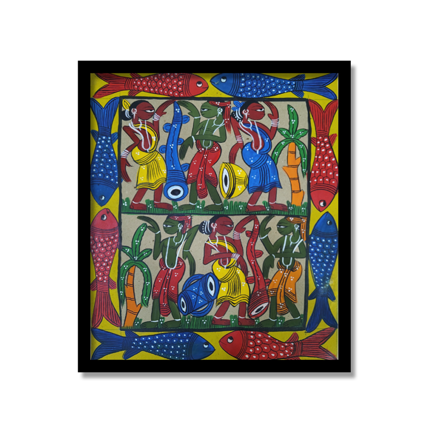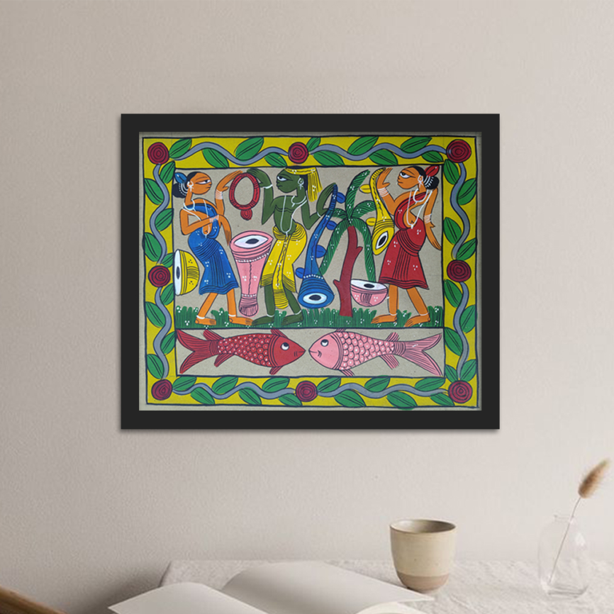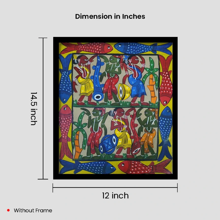 Pattachitra Tribal Dance with Fish Motif Painting | Folk Art Wall Decor