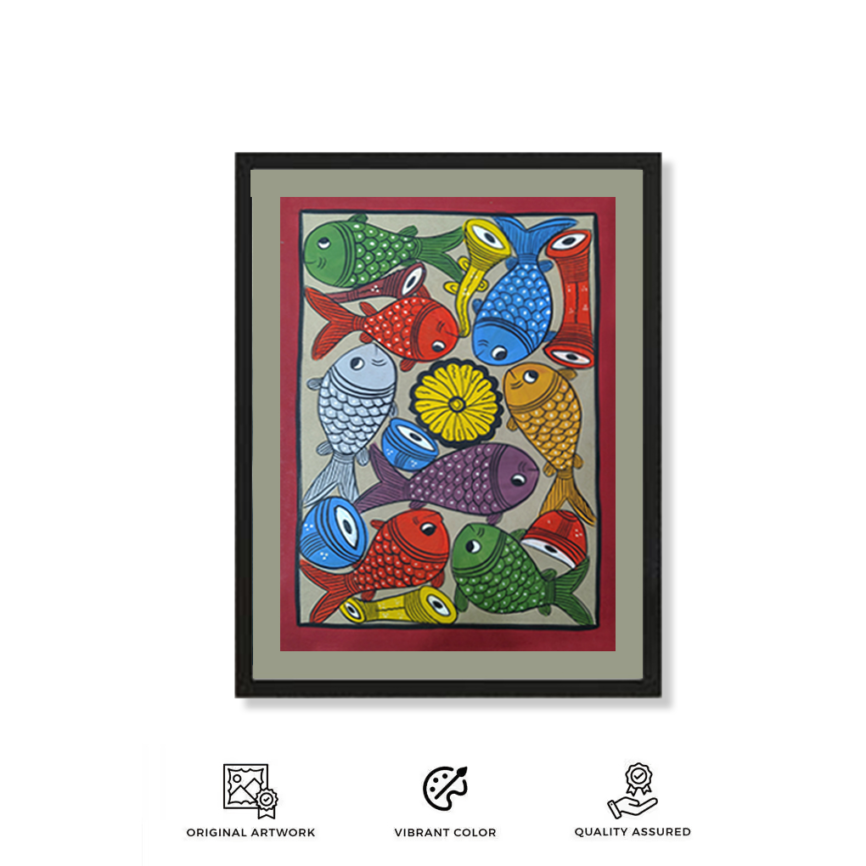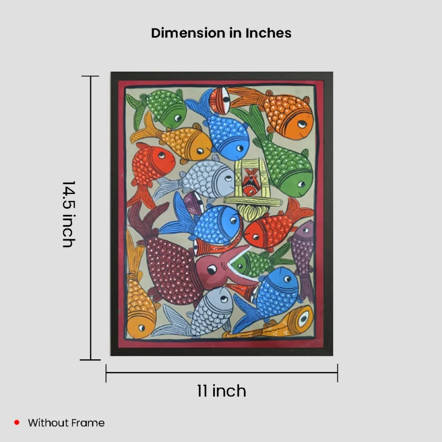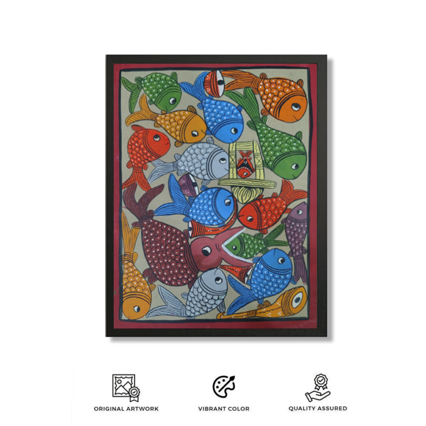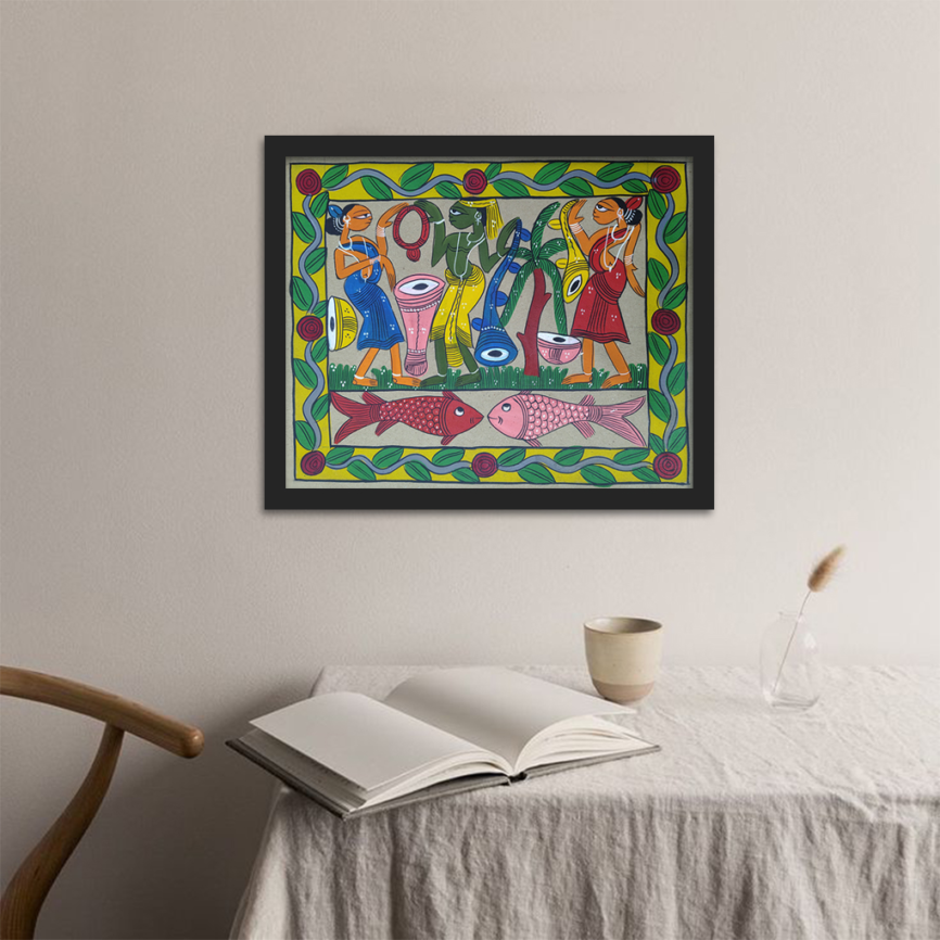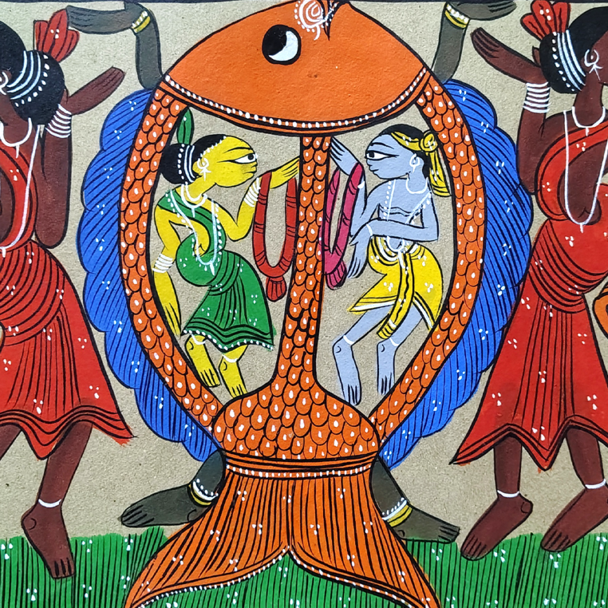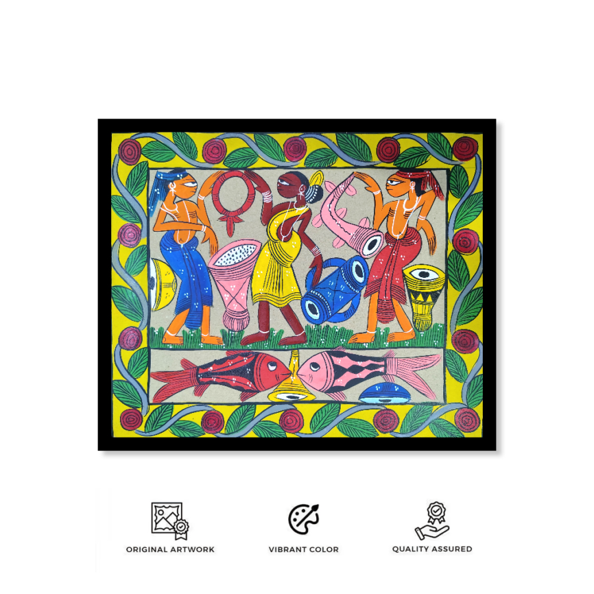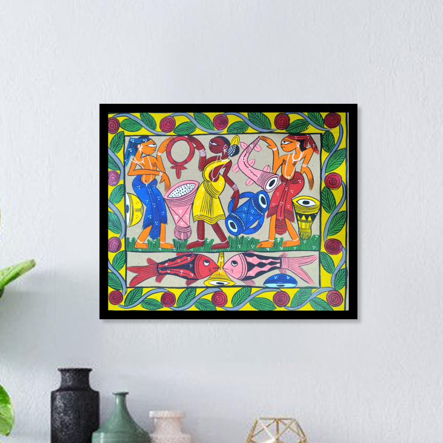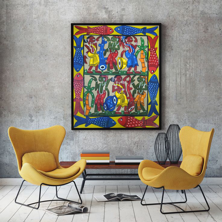 Pattachitra Tribal Dance with Fish Motif Painting | Folk Art Wall Decor