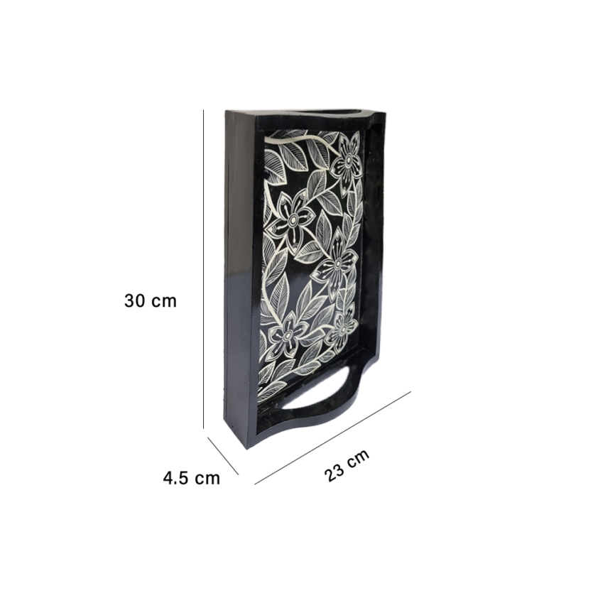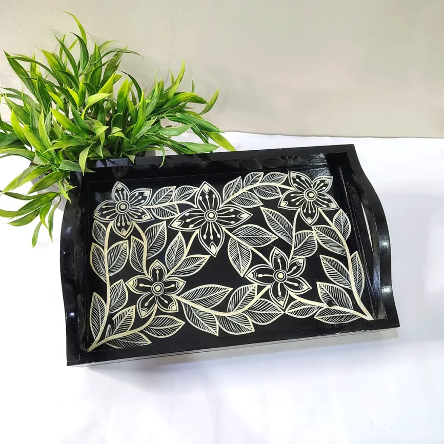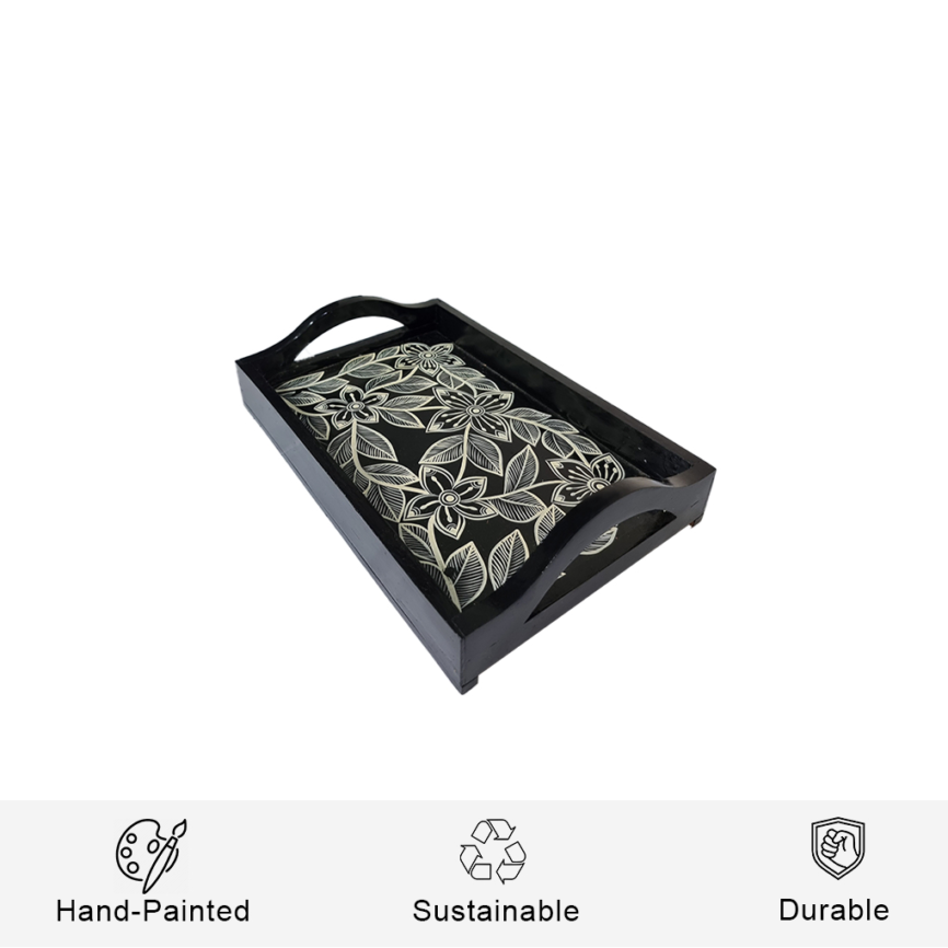 Floral Design Black Wooden Serving Tray