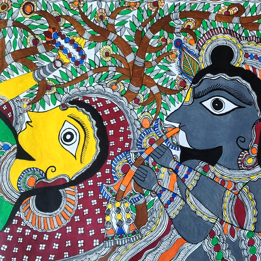 Framed Madhubani Radha Krishna Painting – Traditional Folk Art Wall Décor (9.5 x 9.5 Inch)