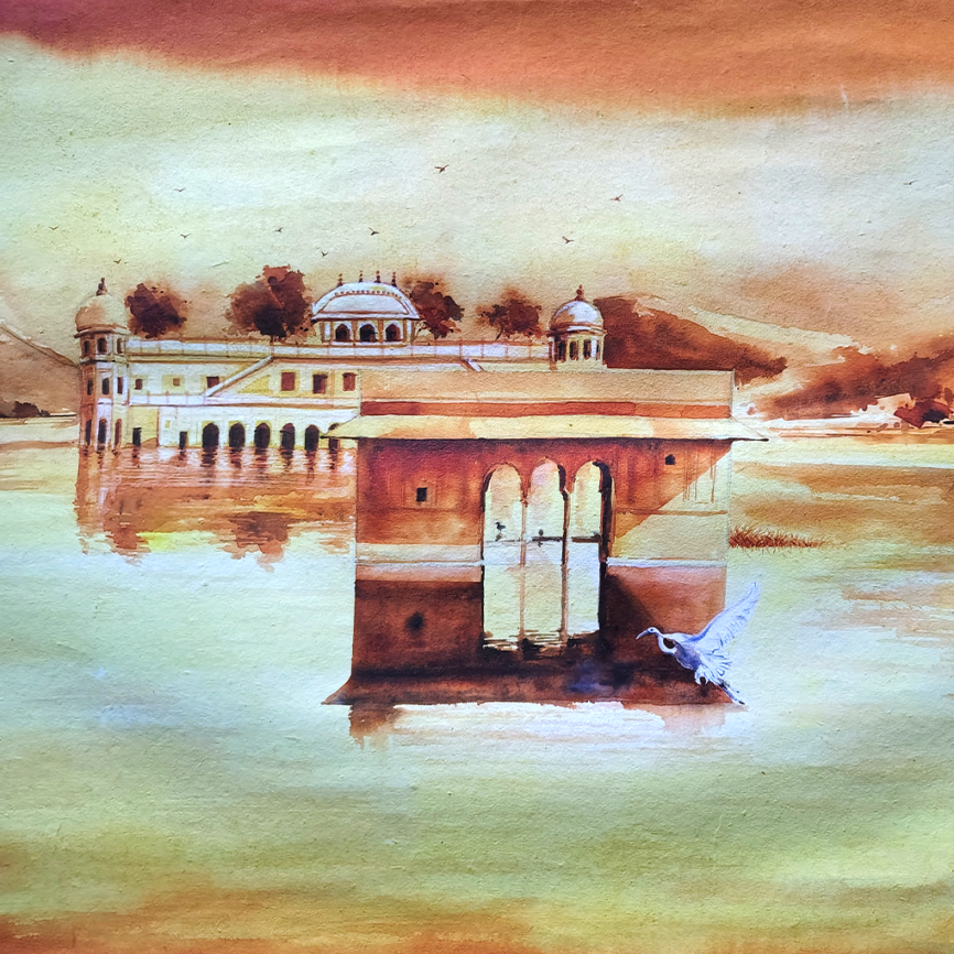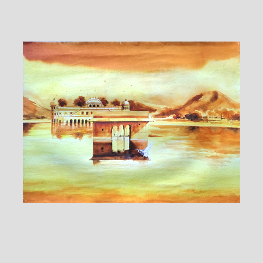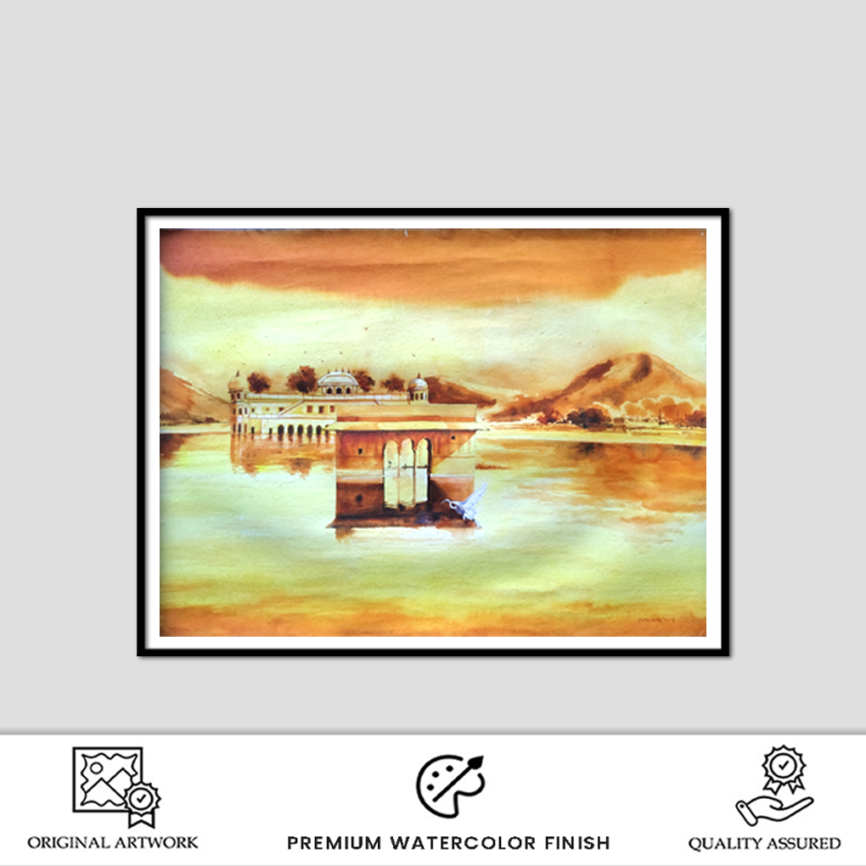 Golden Reflections: Lakeside Palace Watercolour Painting