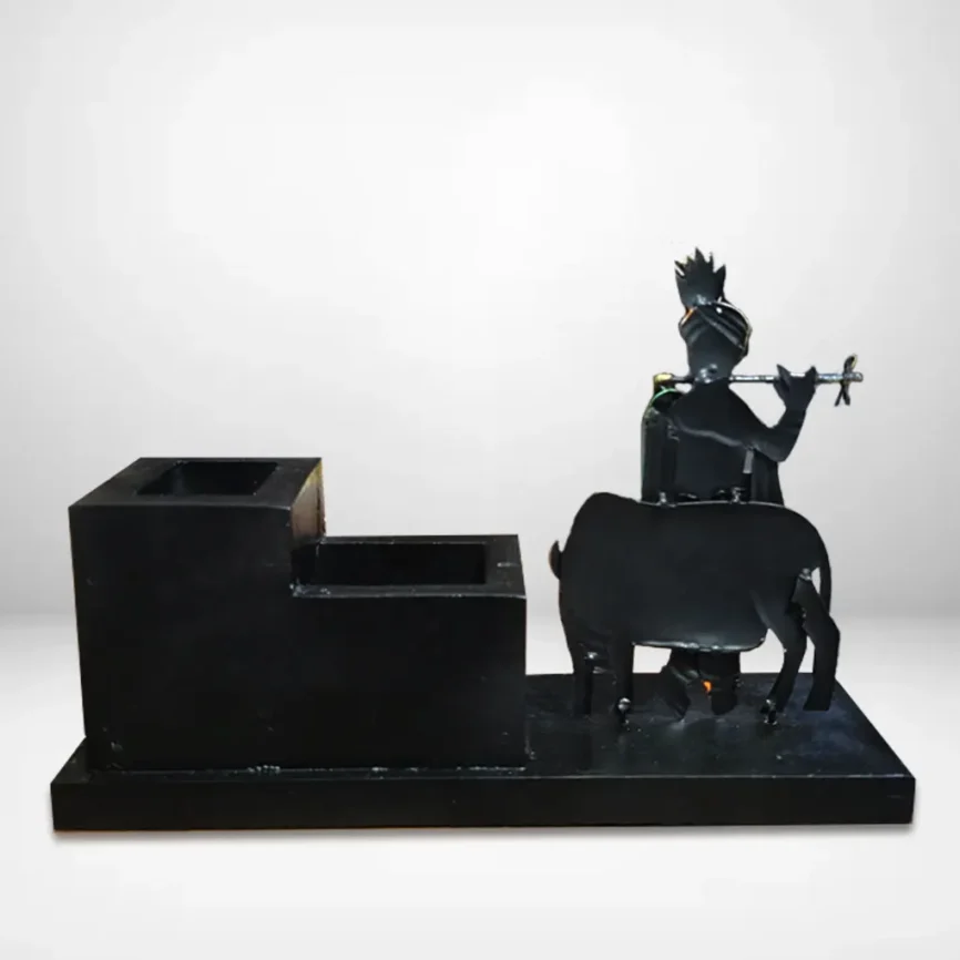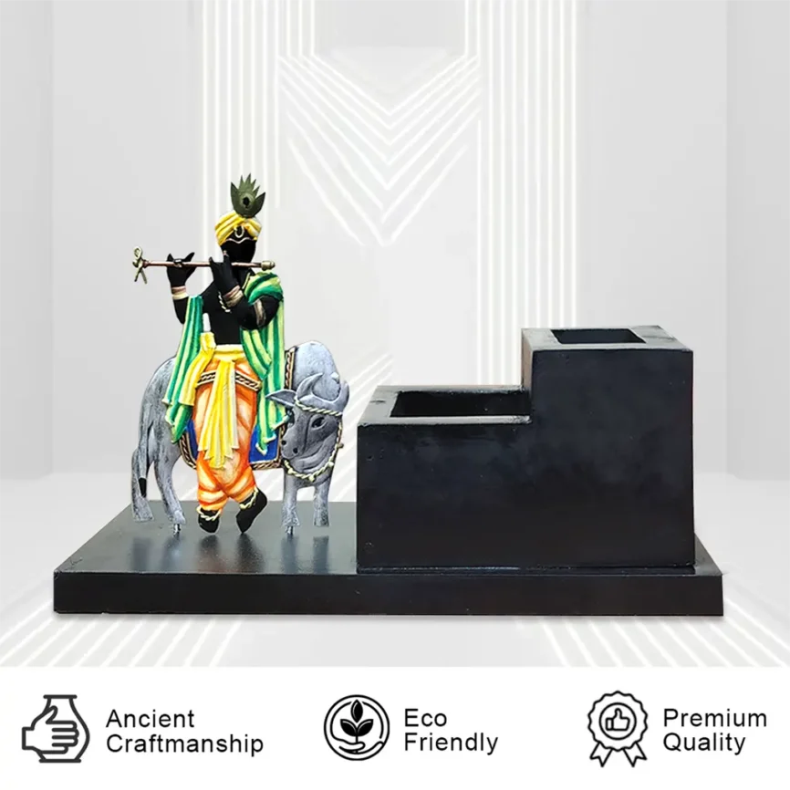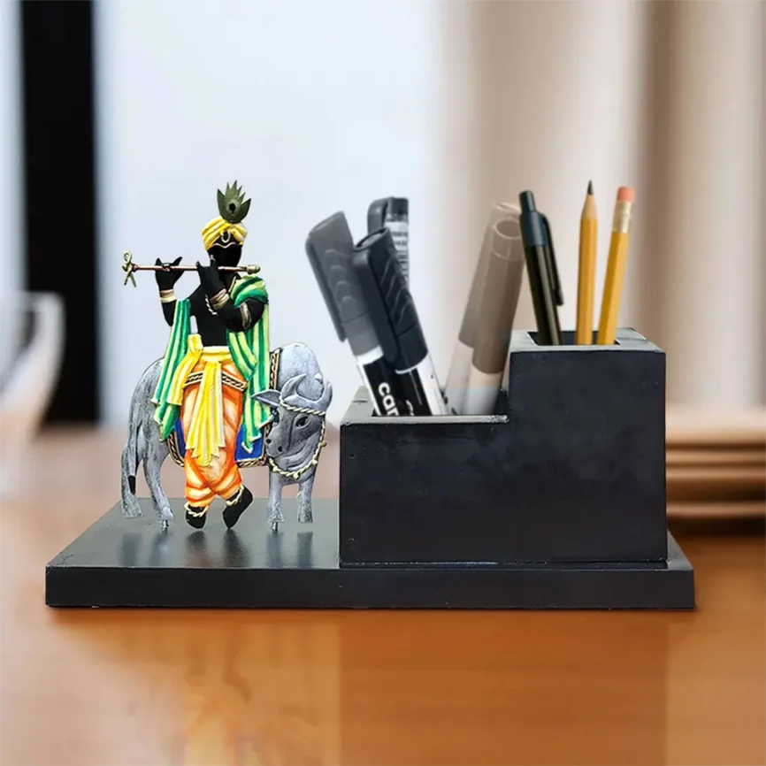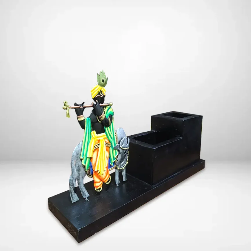 Handcrafted Krishna Pen Stand & Desk Organizer – Customizable Wooden Memento for Office & Home Décor